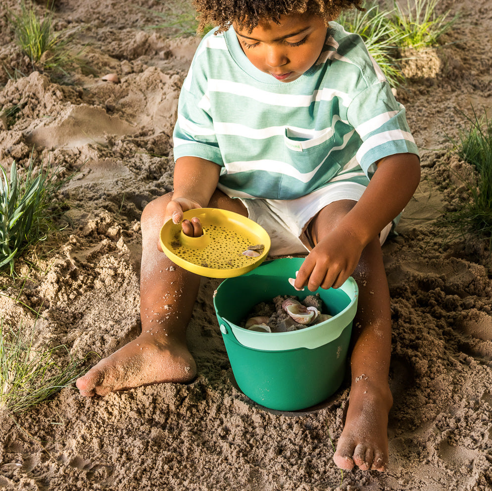 Bucki, das Strand-Essential für kleine Hände. Bucki garantiert stundenlangen Spaß! Nutzen Sie den Eimer und das passende Sieb zum Sammeln, Waschen und Transportieren von Muscheln und anderen kleinen Schätzen. Bauen Sie gerne Sandburgen? Dann ist Buck das perfekte Werkzeug, da es eine praktische Form und einen einrastbaren Griff hat. Auch für alle, die gerne Blätter, Zweige, Blüten und Co. sammeln, ist Bucki der perfekte Begleiter! Wirst du es bei deinem nächsten Abenteuer mitnehmen?