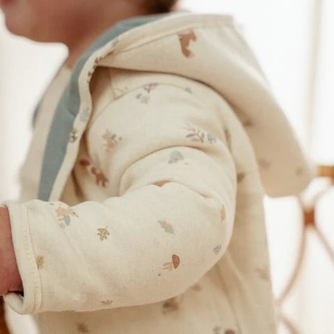 Uma peça cheia de estilo para os dias mais frescos da primavera e as noites frescas de verão. Este adorável casaco reversível foi criado com carinho e amor para oferecer conforto e estilo ao seu recém-nascido. Feita de tecido leve e macio, esta jaqueta é perfeita para manter o seu pequenote quente e aconchegante. De um lado, encontrará um tom suave de azul com detalhes em tom areia e um pequeno bordado de folhas da floresta. Vire-a do avesso e surgirá a bonita estampa Amigos da Floresta, repleta de folhas, bolotas, cogumelos, raposas, ouriços e muito mais. Fabricado em algodão orgânico, ligeiramente acolchoado e com fecho de botões de pressão, este casaco reversível proporciona conforto e segurança para o seu recém-nascido.