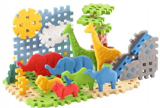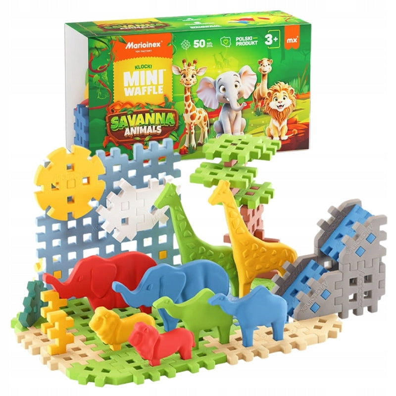 Bem-vindo à savana! Com o conjunto MINI WAFLE ANIMALS Savanna, o seu filho viajará pelo mundo dos animais selvagens e da brincadeira imaginativa. Este conjunto colorido combina blocos clássicos MINI WAFLE com 8 adoráveis figuras de animais que estimulam a criatividade e apoiam o desenvolvimento motor fino. Dentro do conjunto, encontrará 42 blocos de construção macios e flexíveis e 8 figuras de animais em forma de girafas, leões, elefantes e camelos — dois de cada espécie. Graças ao seu design único, os blocos ligam-se facilmente, permitindo às crianças construir estruturas 3D, enquanto as figuras planas de animais se tornam moradores perfeitos do mundo de savana criado.