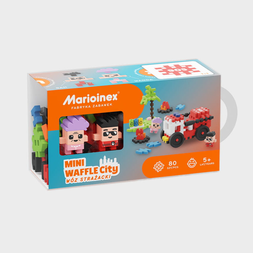 Foi mais um dia agradável em Waffle City. A Sra. Wanda regressava de um passeio e dirigia-se para o pequeno parque que levava ao seu apartamento. De repente, foi atingida por um forte cheiro a fumo. Assustada, viu que havia um incêndio em redor da lixeira. No mesmo segundo, ela pegou no telefone e ligou para os Bombeiros! O camião dos bombeiros, equipado com um canhão de água e liderado pelo bombeiro Sam, controlou o fogo em poucos instantes! É por isso que cada cidade deve ter o seu heróico bombeiro. Construa um camião de bombeiros, com o qual possa extinguir qualquer incêndio. Enriqueça Waffle City com um parque, um camião de bombeiros e duas personagens originais: a Sra. Wanda e o bombeiro Sam. Construa um camião de bombeiros fiável que, com a ajuda de blocos que imitam a água, extinguirá chamas perigosas e protegerá a Sra. Wanda. E esta não é, certamente, a única intervenção que o bombeiro Sam fará. Crie a sua própria história durante a brincadeira e desenvolva a imaginação da criança, incluindo a imaginação espacial.