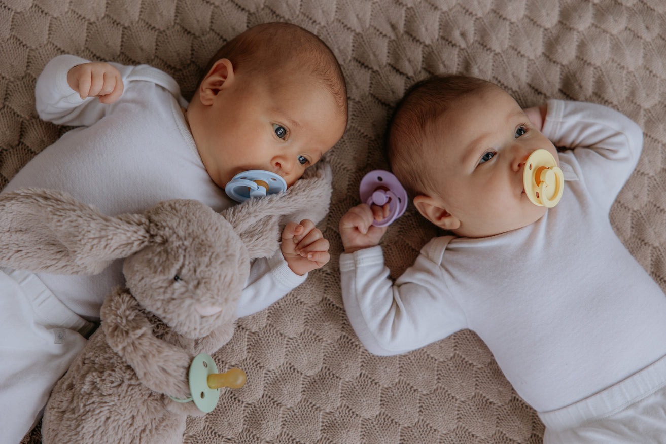 Packung mit 2 Bibs-Schnullern in den Farben Fossilgrau und Mauve.