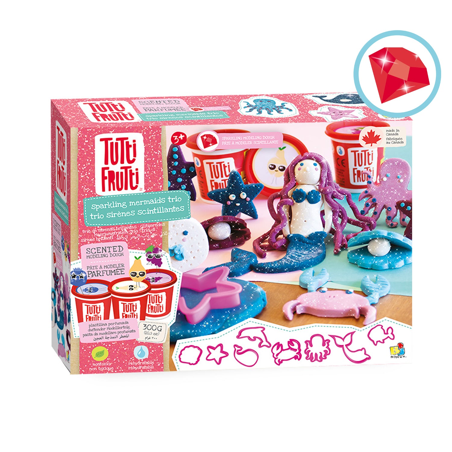 - 3 x 100 g Tutti Frutti Sparkling Playdough (Schimmerndes Lila – Traube, Funkelndes Weiß – Birne, Funkelndes Blau – Blaubeere)