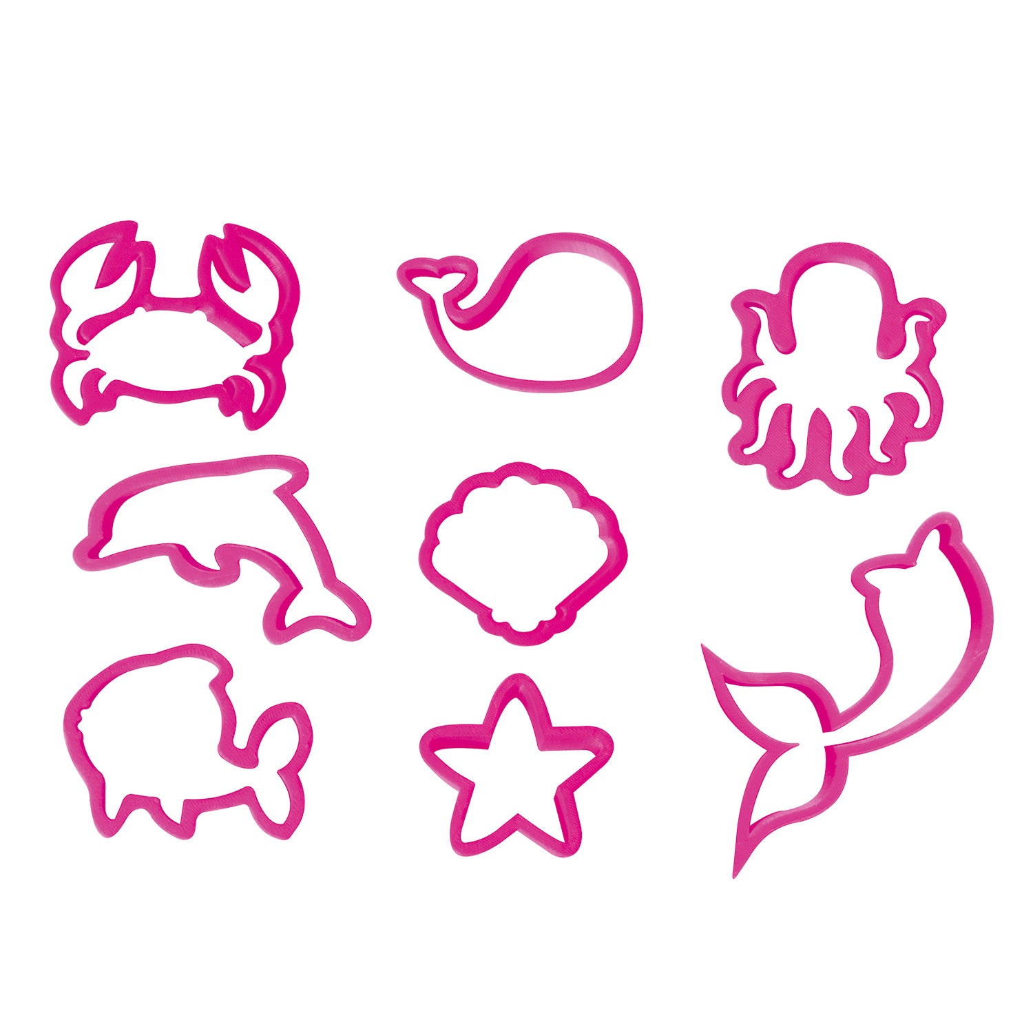 Besuchen Sie das Great Barrier Reef und stellen Sie sich die schönsten Sirenen vor. Mehrere Behälter mit glitzernder Spielknete und ein Satz großer Ausstechformen zum Thema Ozean und Sirenen.