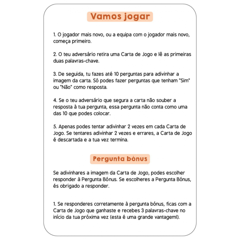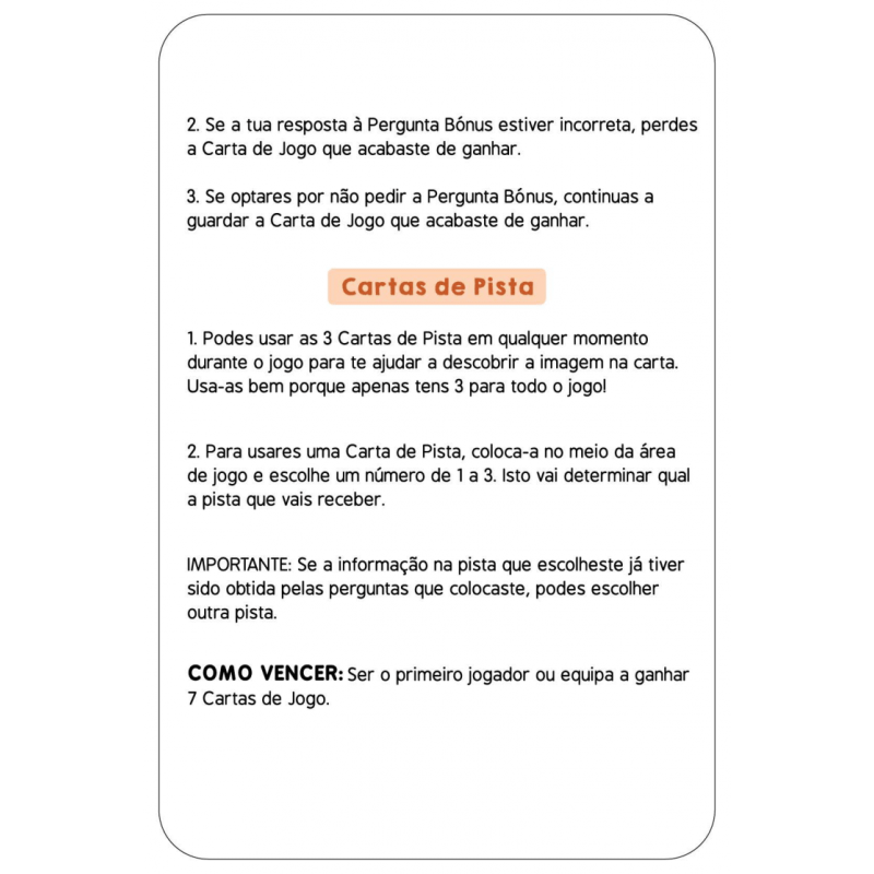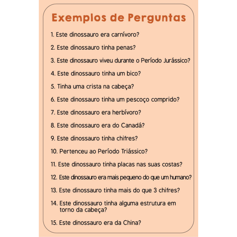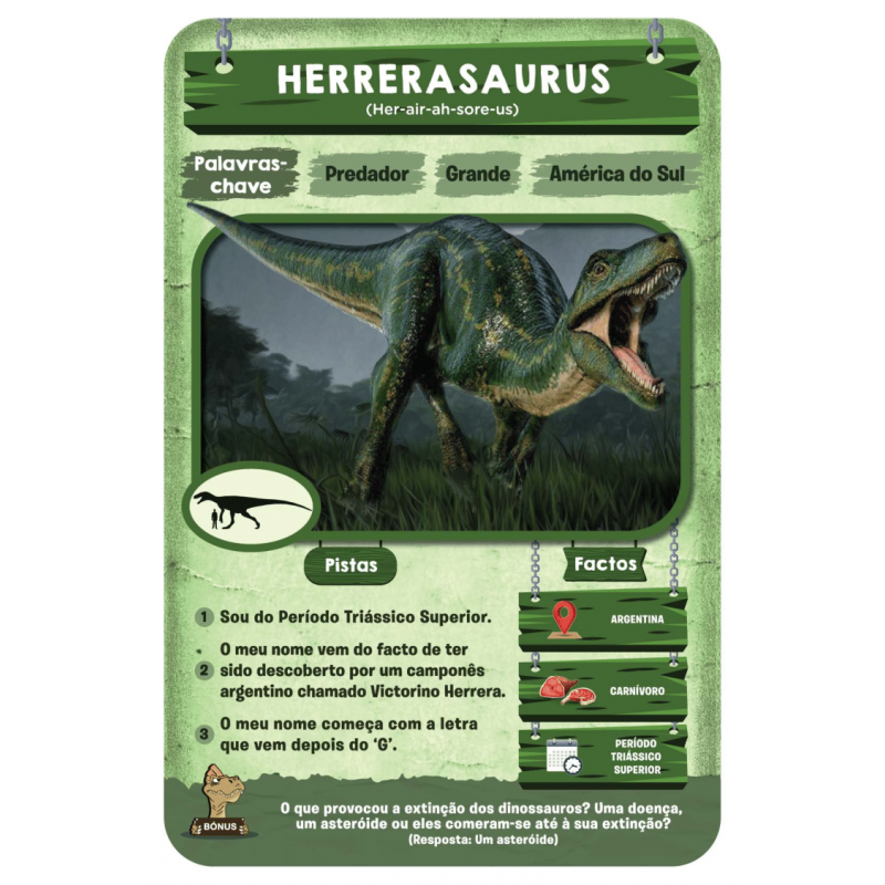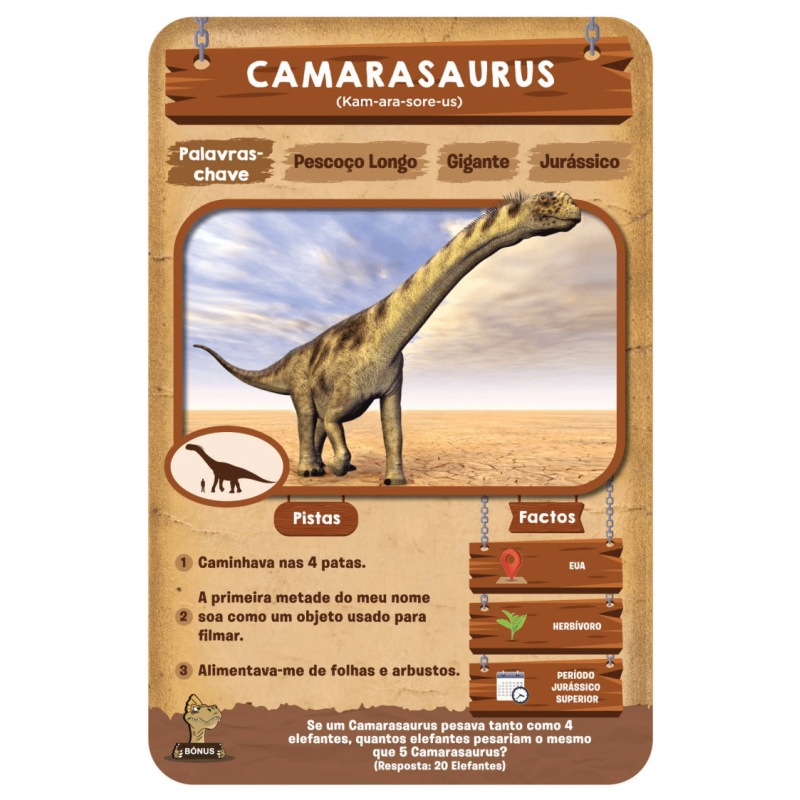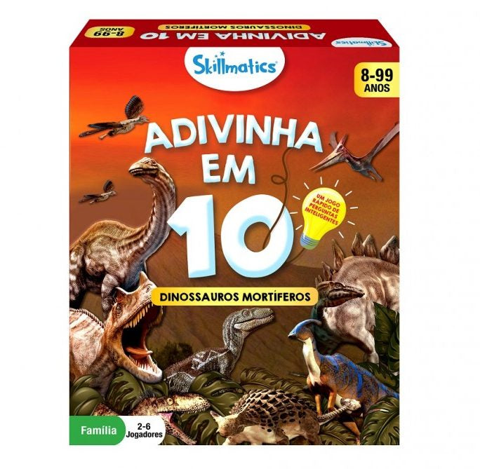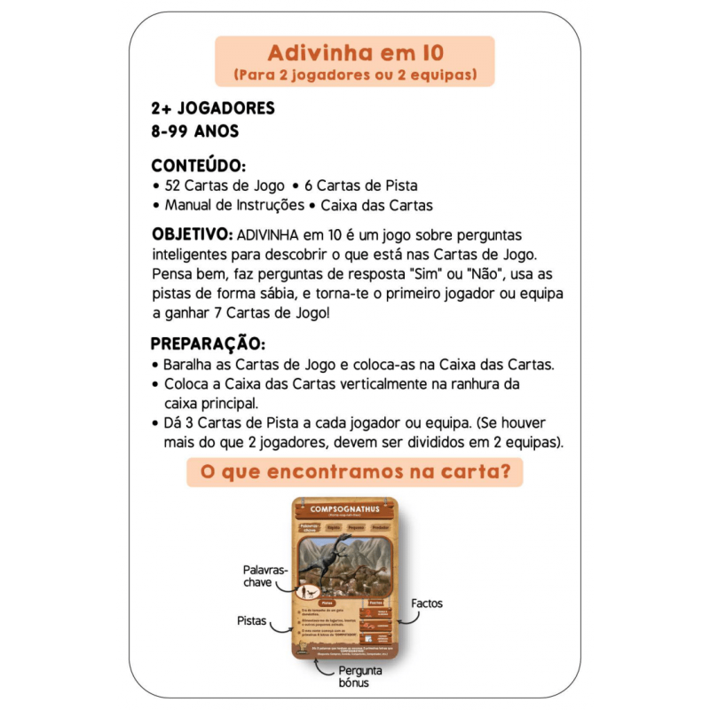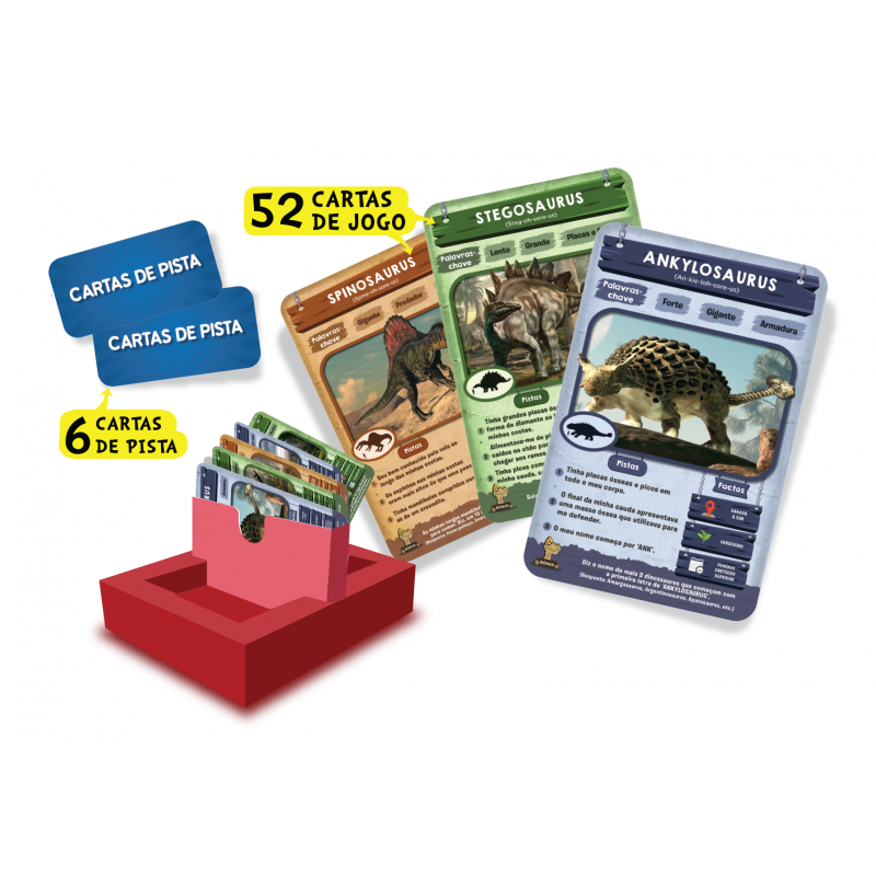 Consegues adivinhar em 10? Prepara-te para jogares o mais entusiamante jogo de perguntas de sempre! Faz até 10 perguntas para adivinhares o dinossauro que está na Carta de Jogo! Tinha uma crista na cabeça? Alimentava-se de plantas? Este dinossauro pertenceu ao Período Triássico? Pensa bem, faz perguntas inteligentes, usa as tuas Cartas de Pista de forma sábia, e sê o primeiro a ganhar 7 Cartas de Jogo!