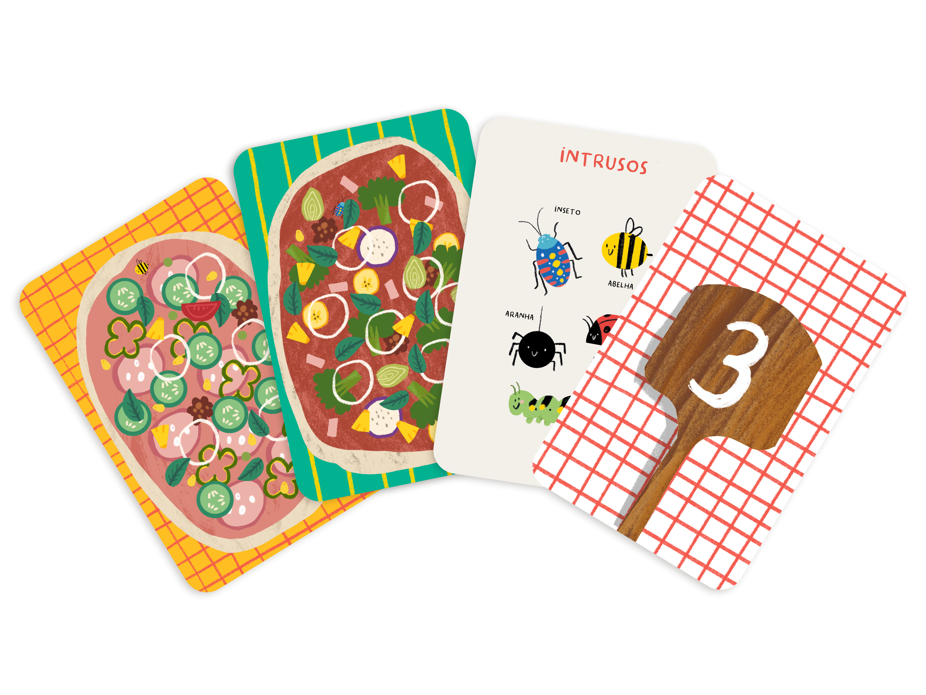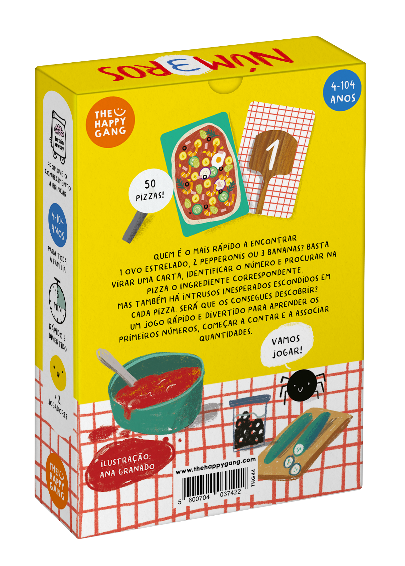 Quem é o mais rápido a encontrar 1 ovo estrelado, 2 pepperoni ou 3 bananas? Basta virar uma carta, identificar o número e procurar na pizza o ingrediente correspondente. Mas também há intrusos inesperados escondidos em cada pizza, será que os consegues descobrir? Um jogo rápido e divertido para aprender os primeiros números, começar a contar e associar quantidades!