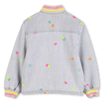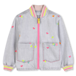 Este vibrante blusão de ganga BILLIEBLUSH espalha um bom humor instantâneo. Os pequenos corações multicoloridos bordados estão por toda a parte, enquanto as elegantes canelas no decote e nos punhos dão um toque desportivo e chique. Adoramos os seus práticos bolsos com remendo e fecho fácil de manusear. Uma peça favorita para iluminar cada look, desde umas calças de ganga do dia a dia a uma saia de tule.