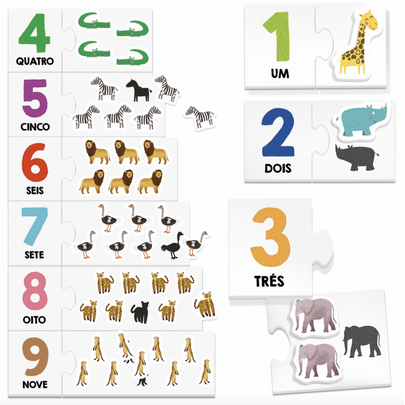 Quantos elefantes são? E crocodilos? Conta os animais recortados e associa a quantidade ao algarismo respetivo! Um jogo original para aprender os números e aprender a contar, com tantos animais simpáticos!