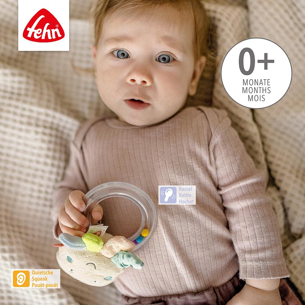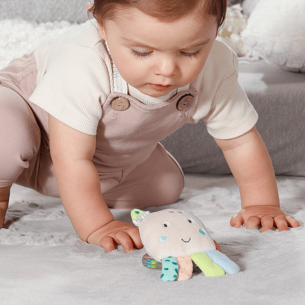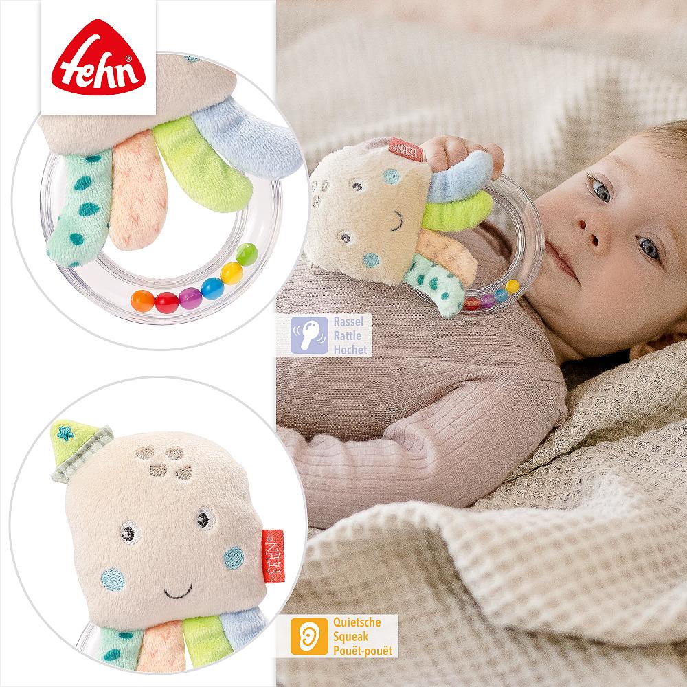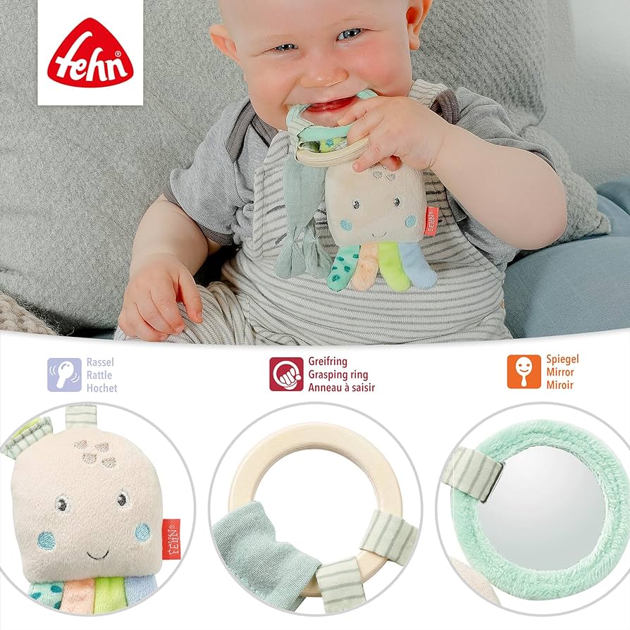 - O chocalho de polvo da coleção Meerkinder é fácil de agarrar, sentir, chacoalhar e guinchar e assim desperta a curiosidade dos bebés e os convida à descoberta e à pesquisa. O brinquedo macio para bebé com chocalho e guincho é muito divertido ao sacudir, agarrar e brincar e promove a audição, a pegada e o tato do bebé, bem como as habilidades motoras finas e o aprendizado precoce. Os pequenos exploradores vão rapidamente levar o lindo polvo de tecido para o coração e levá-lo consigo para todo o lado como um companheiro fiel - seja em casa, em viagem, na cadeira de bebé ou no carrinho!