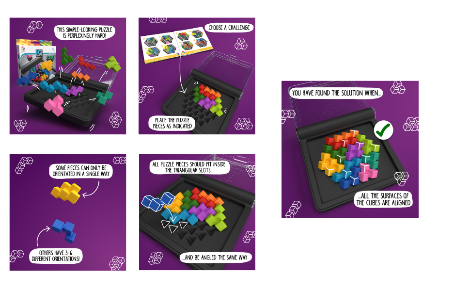 - Etapa 3: Encontrou a solução quando todas as peças cabem no tabuleiro de jogo E as superfícies dos cubos estão alinhadas entre si.
