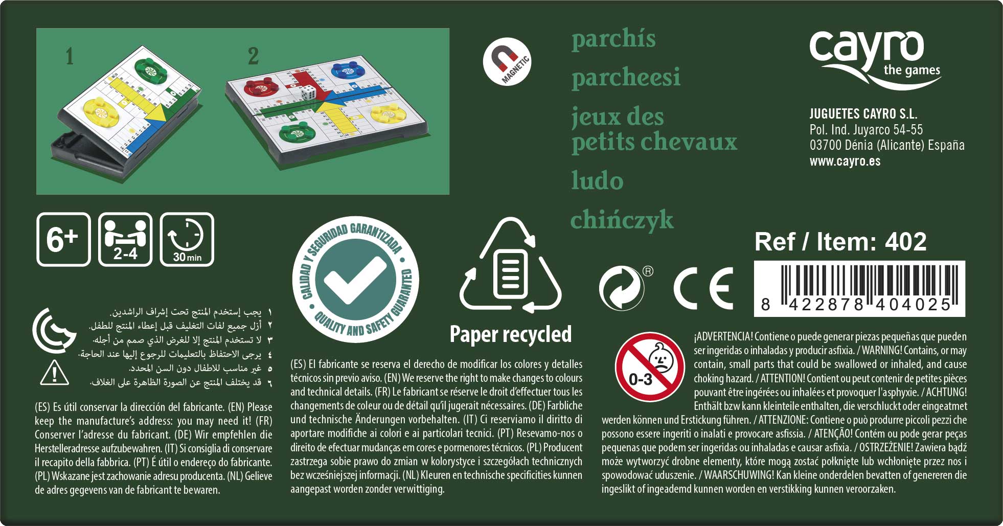 É um tabuleiro de ludo que se dobra ao meio para virar um estojo para guardar as fichas. A superfície é metálica e os chips são magnéticos, por isso, juntamente com o seu pequeno tamanho, tornam-no ideal para viagens. Você pode jogar em movimento e não perderá nenhuma ficha.