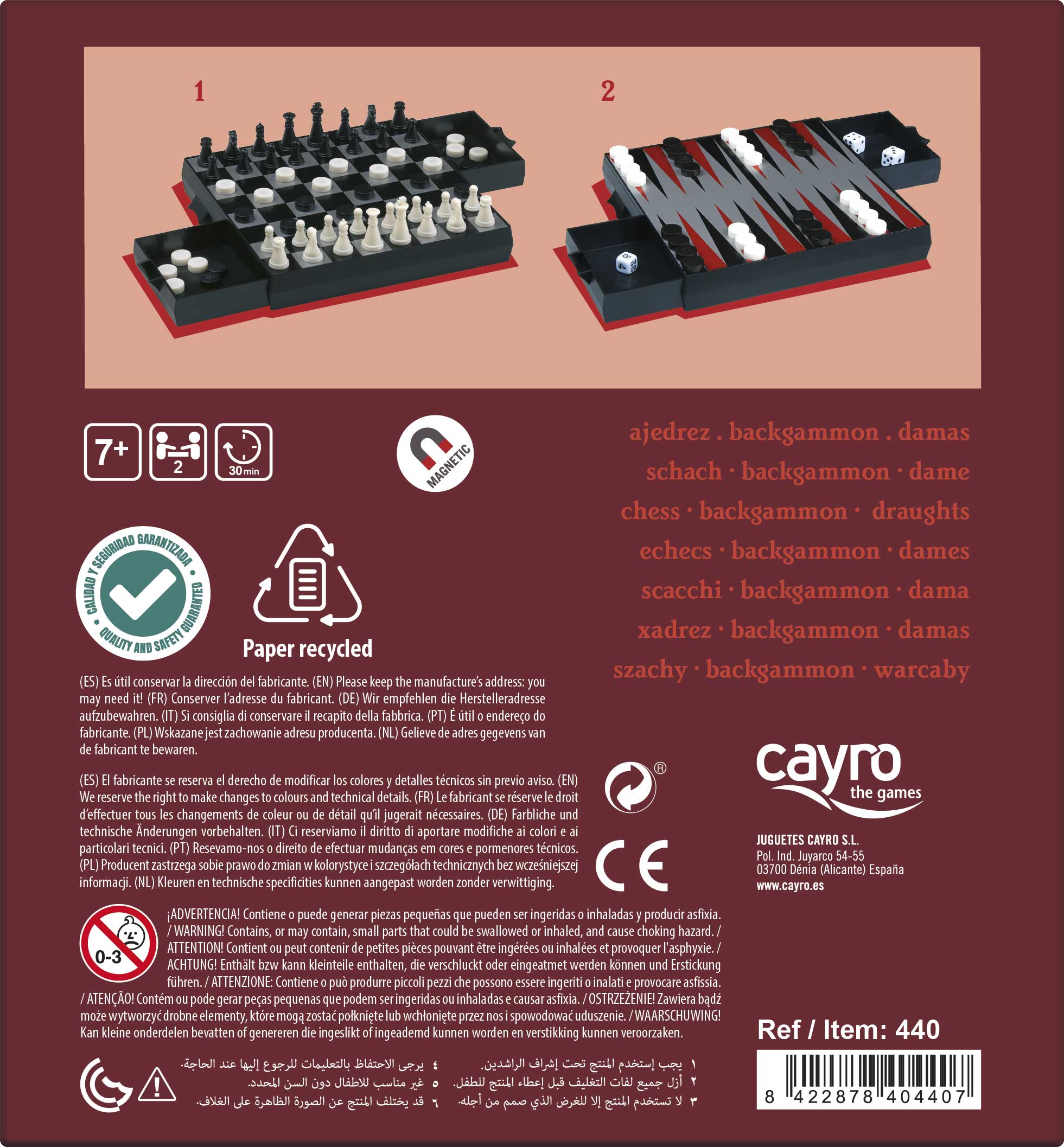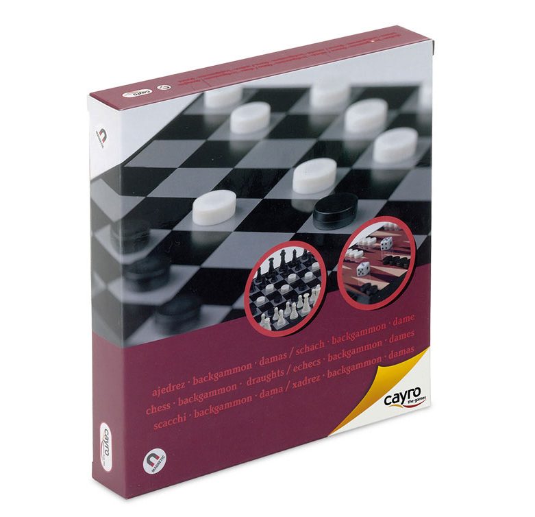 Com esta caixa compacta você pode jogar 3 jogos diferentes, xadrez, damas e gamão. As fichas (magnéticas) ficam alojadas nas gavetas e dependendo da posição em que você coloca o tabuleiro de jogo, você pode ou não conseguir abrir a gaveta