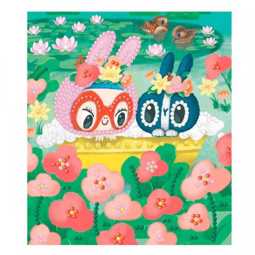 Este kit tiene como objetivo embellecer 4 cartas ilustradas con multitud de mini diamantes facetados. El niño los vierte en la bandeja de clasificación y los agarra, utilizándose el bolígrafo para colocarlos sobre las superficies preencoladas, siguiendo las instrucciones del folleto. Poco a poco los bocetos van ganando relieve y brillo.