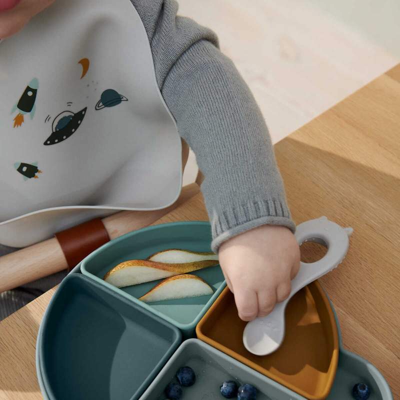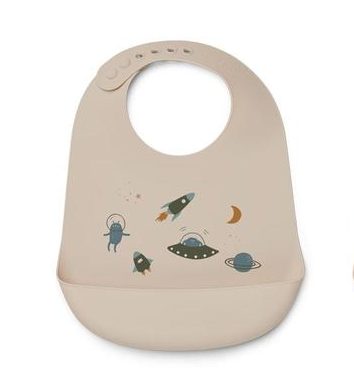 Práctico babero que ayuda a que las comidas sean un poco menos complicadas con un bonito patrón espacial: un elemento esencial para tu cambiador.