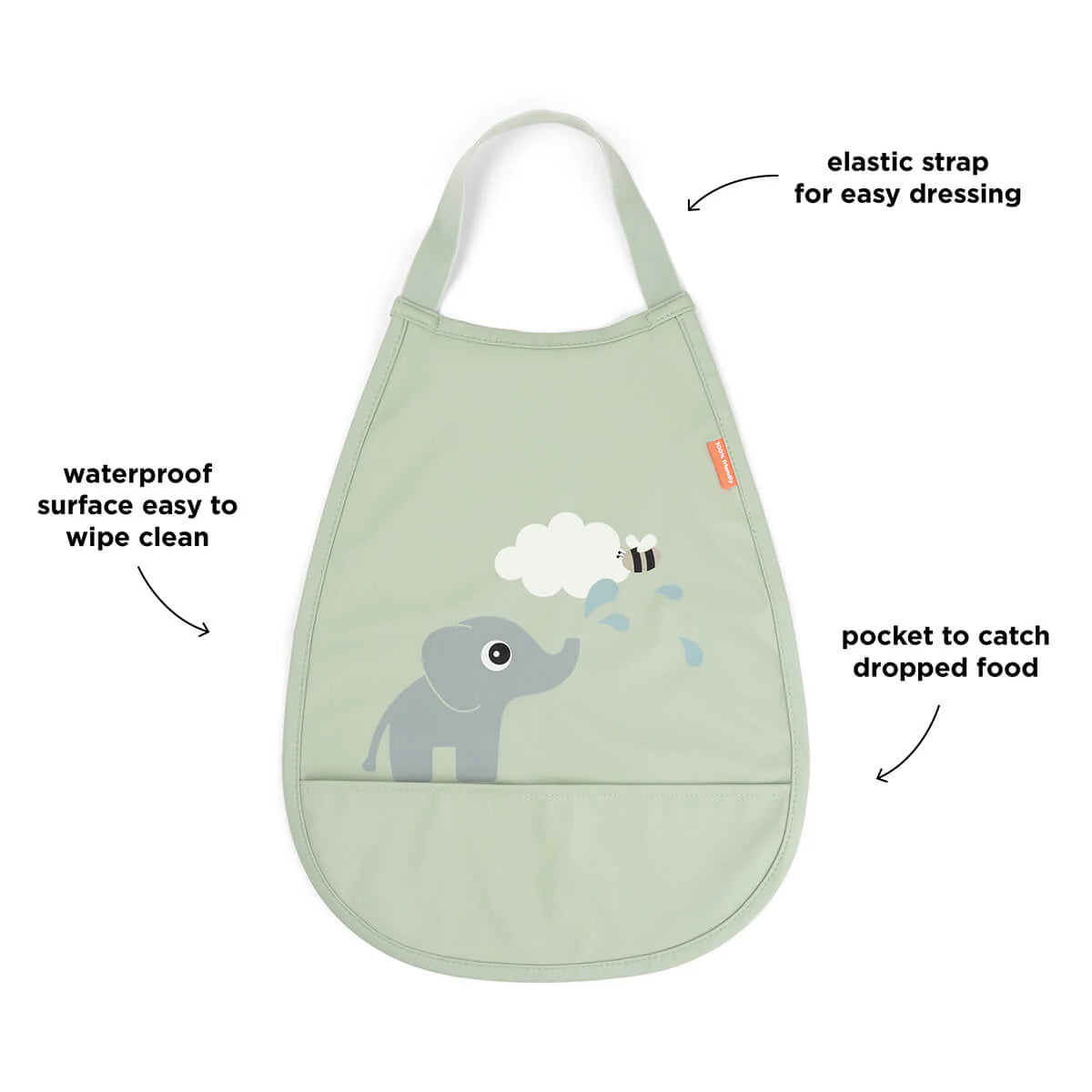Este prático babete de vestir é perfeito para manter o seu pequenote limpo durante as refeições. Com uma superfície repelente à água, é fácil de limpar, facilitando a vida dos pais ocupados. Quando precisar de uma limpeza mais profunda, basta lavar na máquina a 30 °C e estará pronto a utilizar novamente. A correia elástica permite vestir o bebé rapidamente, enquanto o prático bolso recolhe os restos de comida, reduzindo a sujidade. Num bonito tom de verde com um adorável motivo Elphee, este babete dá um toque divertido a todas as refeições.