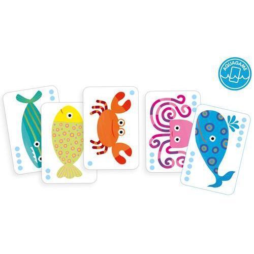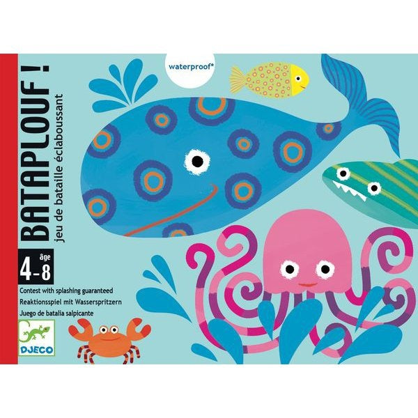 Bataplouf de Djeco es un llamativo juego de cartas: 5 animales marinos nadan en la bañera. Si se dan la vuelta a 2 cartas idénticas, el primero que atrape al animal de la carta gana la ronda; ¡Un juego súper divertido para jugar dentro y fuera del agua (baño, piscina, playa)! Con red para secar las cartas.
