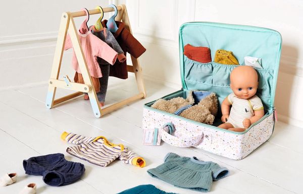 Guardar la ropa de tu muñeca es elegante y sencillo con esta percha de madera que se suministra con tres perchas. La madera natural decorada con diferentes motivos la convierte en un atractivo complemento para la habitación infantil.
