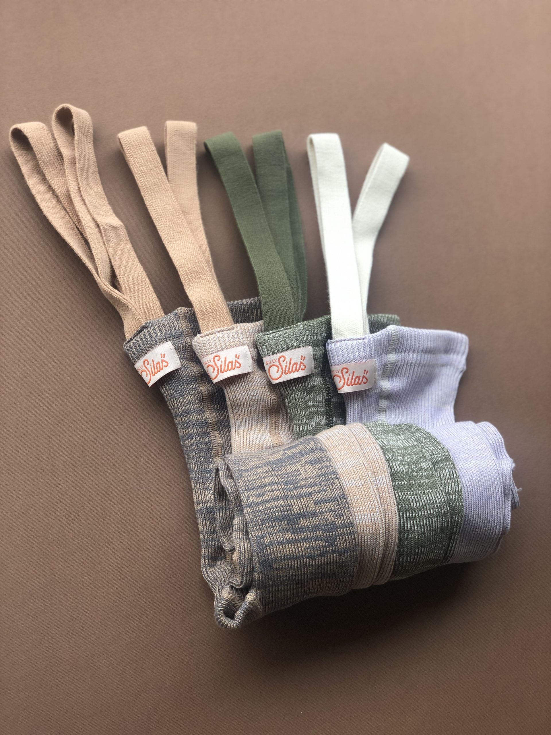 COLECCIÓN PERFECTAMENTE IMPERFECTA. Cada pieza de esta colección es completamente única y presenta un mosaico aleatorio de patrones y formas, una combinación única de líneas y tonos. Es una historia perfectamente imperfecta. Los calcetines sin pies con tirantes Silly Silas acompañarán incluso a los bebés y niños más activos, permitiéndoles explorar el mundo descalzos.