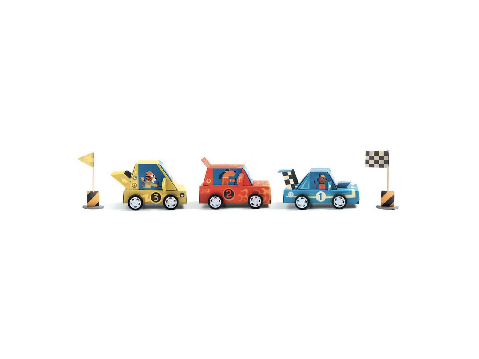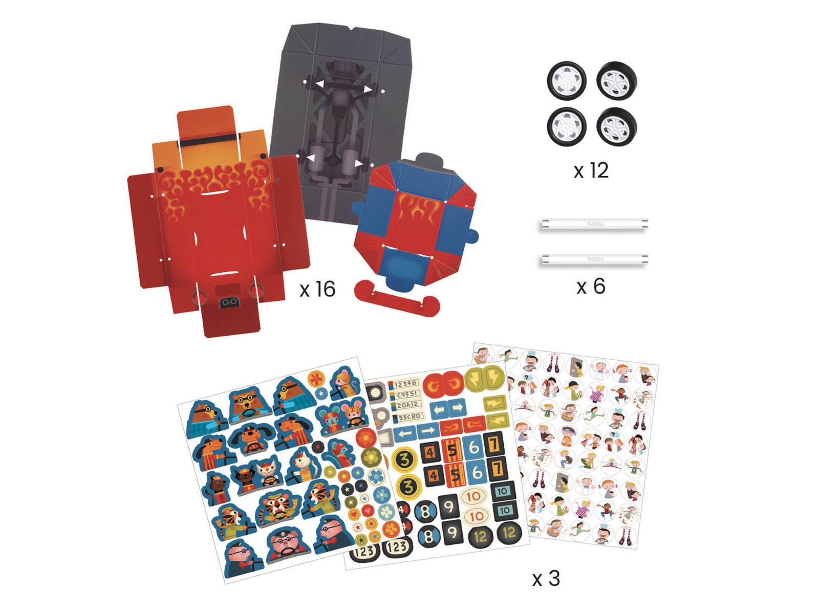 - Contenido: 4 placas ilustradas con piezas precortadas, 12 ruedas, 6 ejes de ruedas, 2 varillas de bambú, 3 hojas de pegatinas, 1 folleto explicativo.