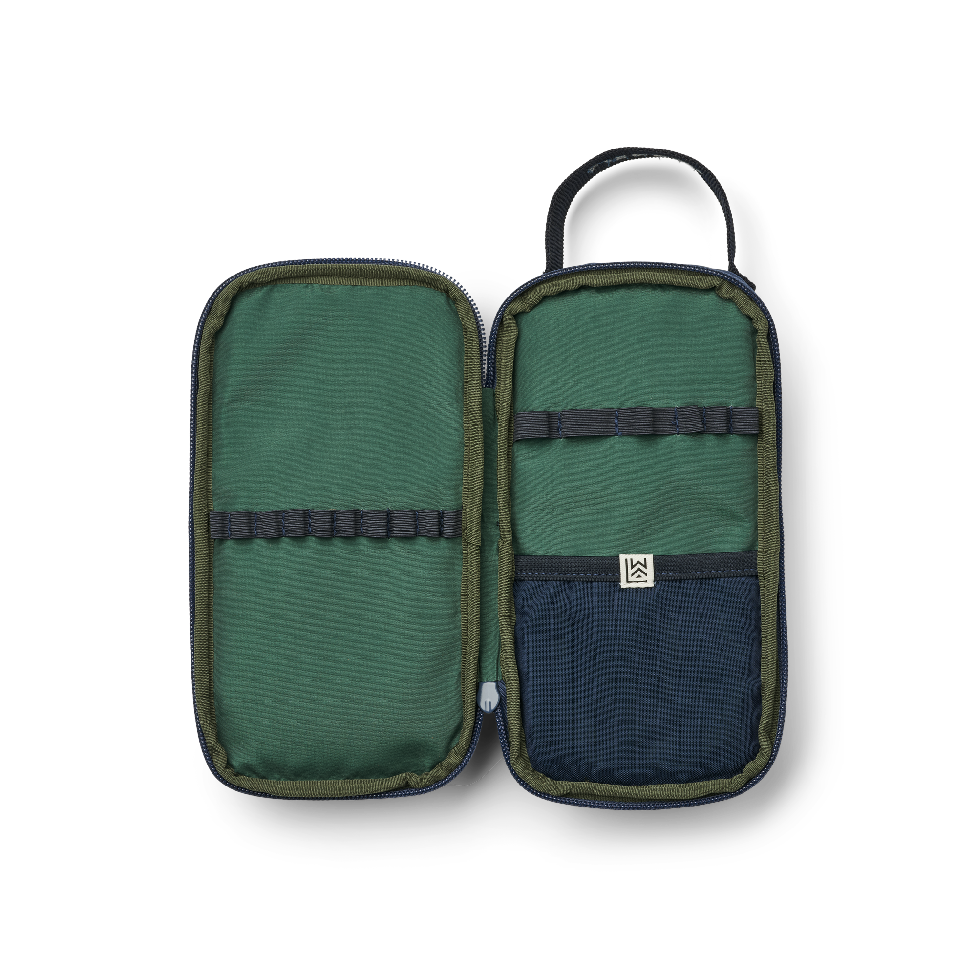 - Sección plegable con cremallera y presillas elásticas para bolígrafos.