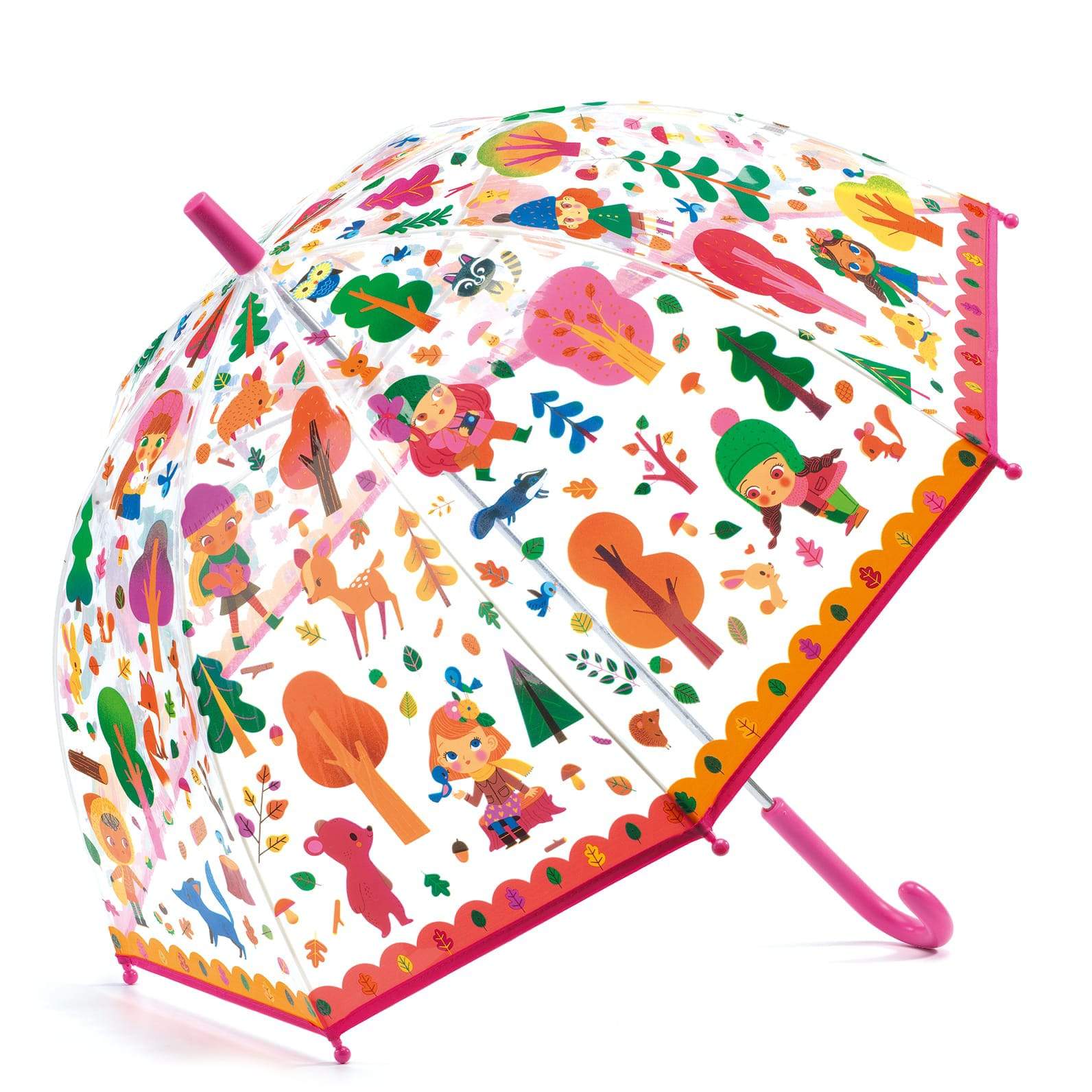 A partir de la colección My Little Big Room de Djeco, diseña complementos para habitaciones infantiles. Para afrontar un día lluvioso y devolverle color al cielo gris, ¡hay paraguas Djeco para niños! Ideal para niños, transparente, con mango fucsia y preciosas ilustraciones de árboles, niños y animales del bosque. ¡Mira cuántos animales diferentes viven en el bosque! Tiene un mango cómodo para los más pequeños y un sistema antipellizcos para proteger sus dedos.
