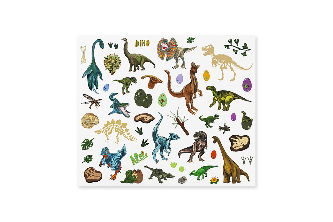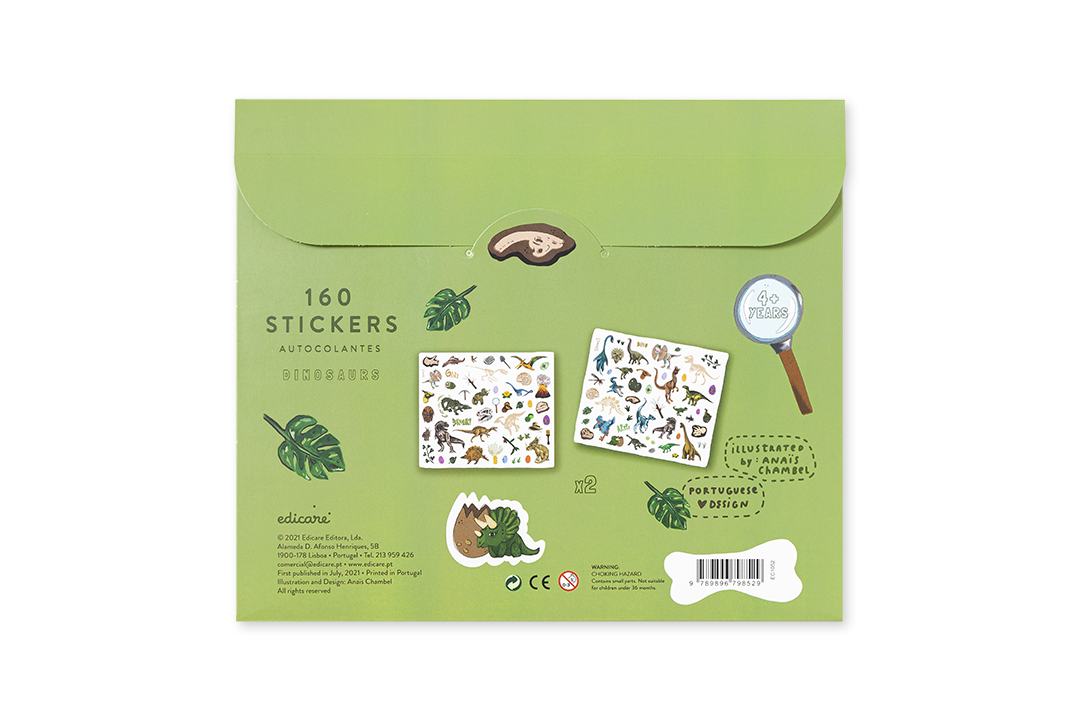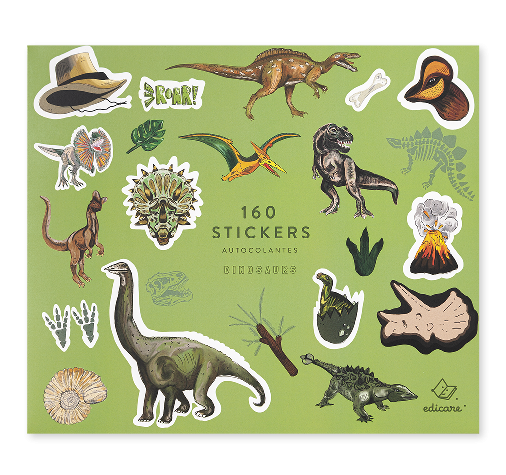 Este conjunto de 160 autocolantes fará as delícias dos fãs de dinossauros. Descobre-os e diverte-te!! Envelope em cartão com 4 folhas de autocolantes; design português.