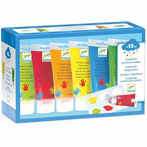 Uma caixa com 6 tubos Djeco de tintas especialmente concebidos para a pintura a dedo. As cores são vibrantes, com uma grande consistência espessa, o que torna a criação daquela primeira obra-prima ainda mais fácil! A tinta a dedo é à base de água, lavável (claro!) E não tóxica.