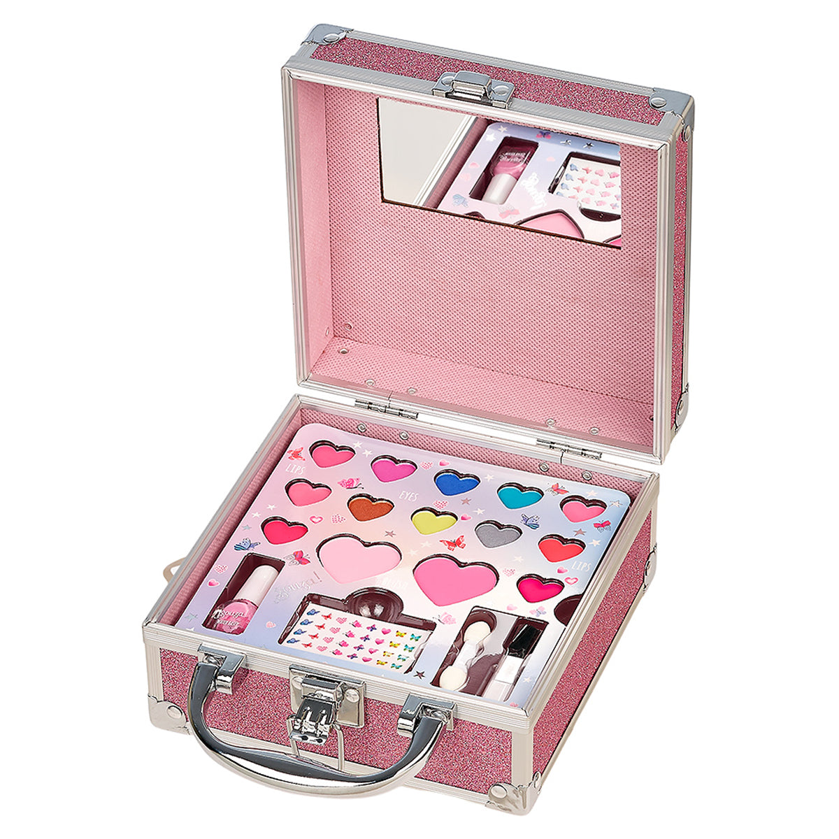 - O conjunto de maquilhagem vem numa linda maleta de cartão com glitter rosa. O estojo possui uma alça e um fecho, e no seu interior existe um espelho de maquilhagem.