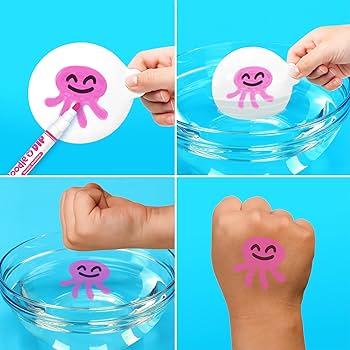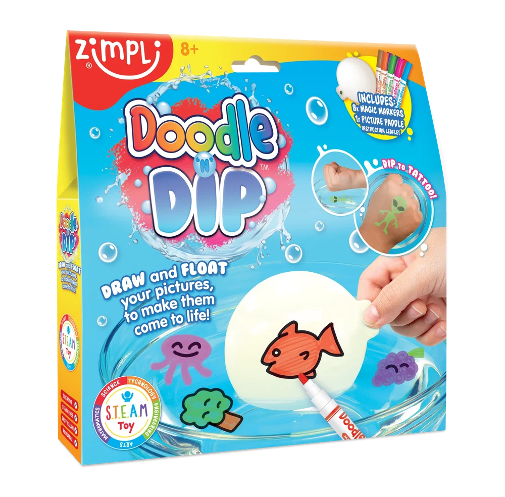 Deixe a sua imaginação correr à solta, enquanto desenha e flutua as suas fotos, para lhes dar vida, e depois mergulhe na tatuagem! Doddle N Dip CONTÉM: 8 x marcadores mágicos multicoloridos, 1 x rabiscar remo, folha de instruções.
