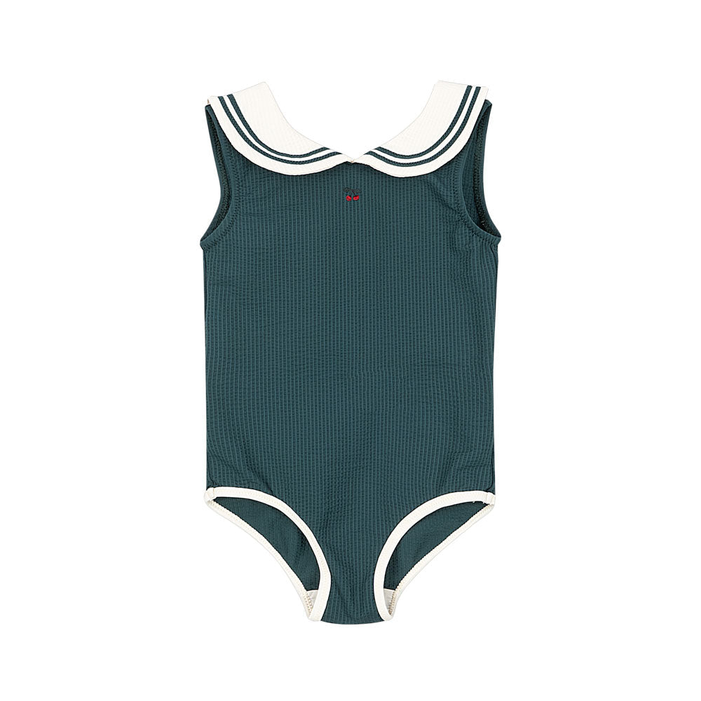 Fato de banho com gola estilo marinheiro na frente e decote em V nas costas. Apresenta a cereja, assinatura da Konges Sløjd, na parte frontal.
