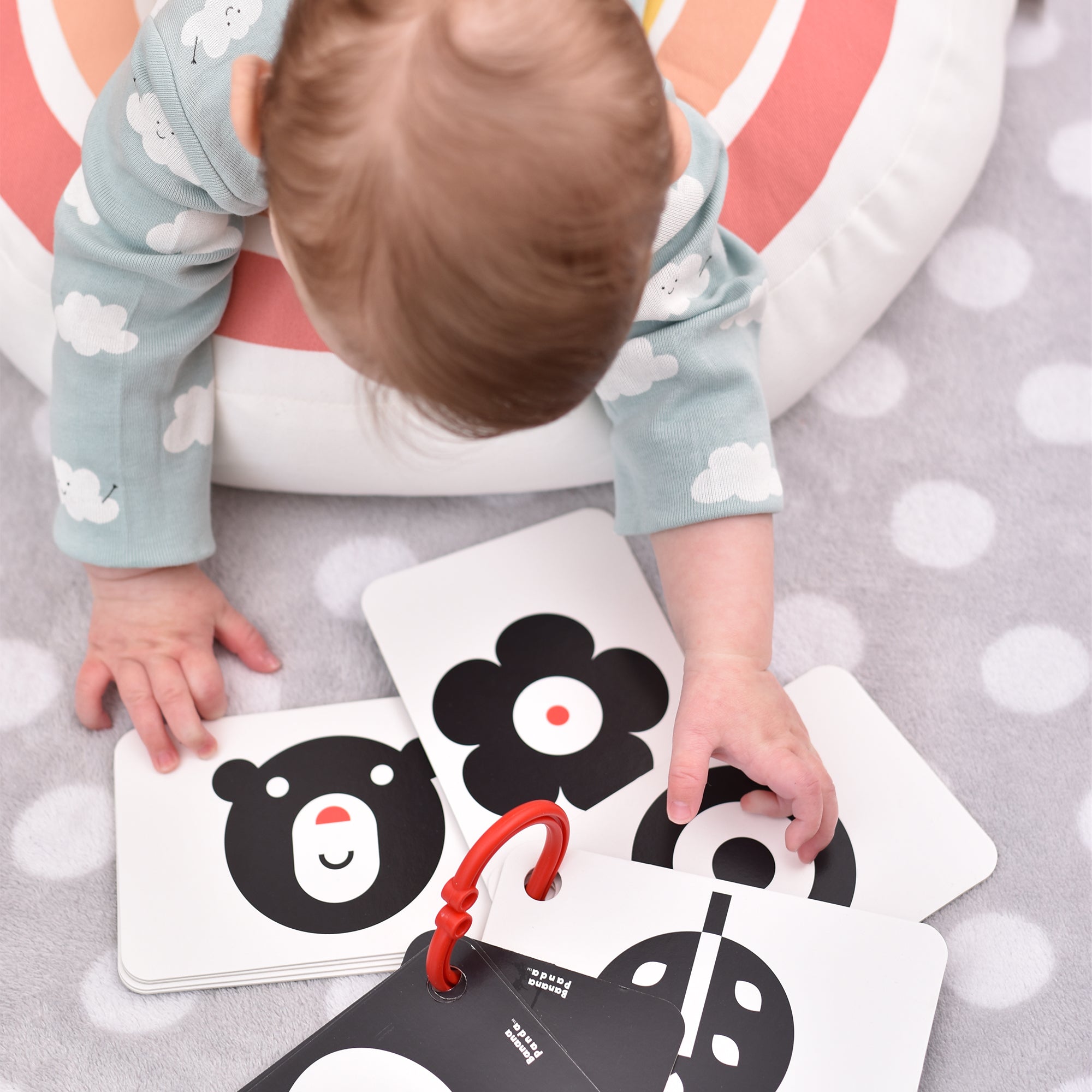 Nunca é cedo para explorar o mundo! Estes cartões flash frente e verso com vinte ilustrações grandes são adequados para os bebês mais pequenos, que só conseguem ver cores de alto contraste e contornos distintos. Padrões simples e claros, ajustados à percepção visual dos bebês, atraem a atenção do bebê e apoiam o desenvolvimento visual. Graças ao anel de plástico, você também pode pendurar os cartões ao lado da cama ou do carrinho do bebê, ou no celular. Cada conjunto inclui um guia preparado pela psicóloga infantil Agnieszka Ostapczuk contendo informações sobre o desenvolvimento da primeira infância para os pais. O guia explica a importância de incentivar o desenvolvimento do cérebro numa fase inicial e como os Flash Cards de alto contraste podem ajudar.