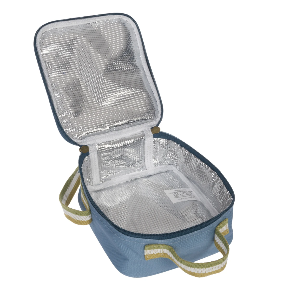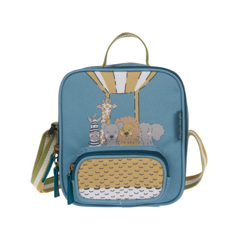 Esta mini lancheira apresenta uma adorável zebra, girafa, ursinho de pelúcia, leão e elefante flutuando em um balão de ar quente em um fundo azul-céu. Esta lancheira é excelente para bebés e crianças pequenas e é ideal para ir ao berçário ou fazer piqueniques no parque ou no jardim. É totalmente isolado para manter os alimentos frescos e possui um forro seguro para alimentos.
