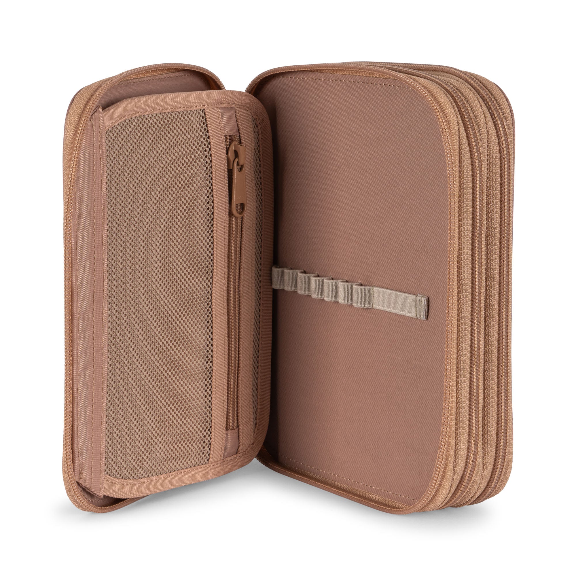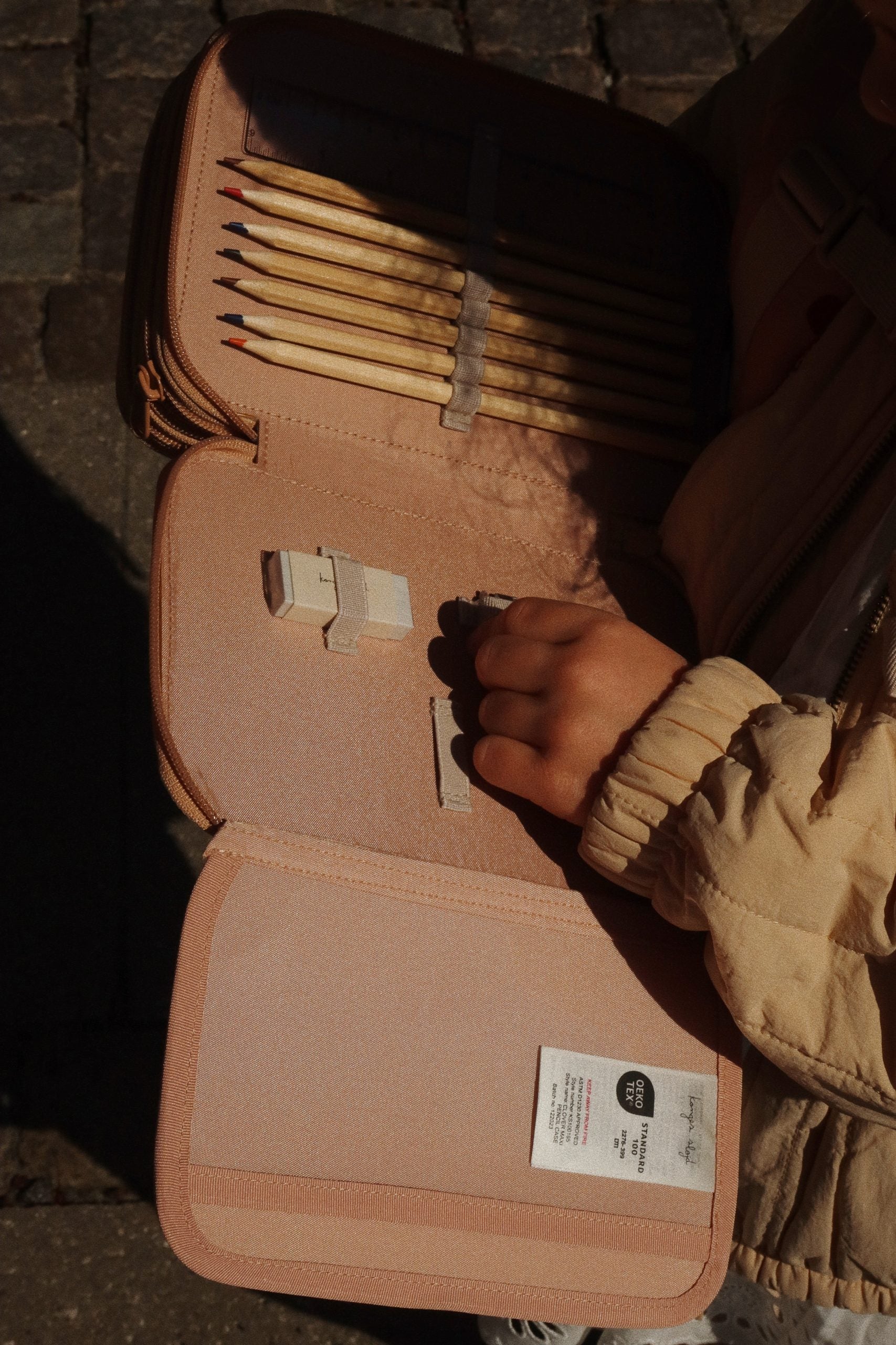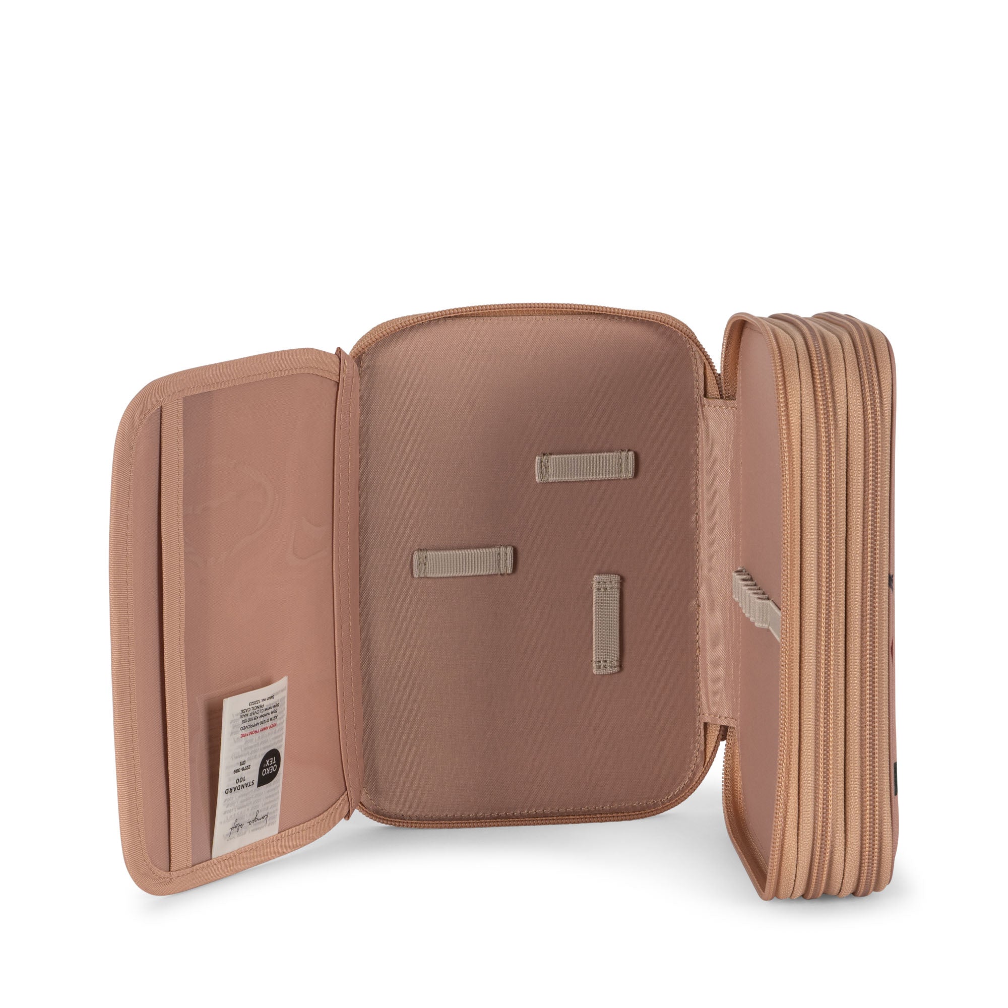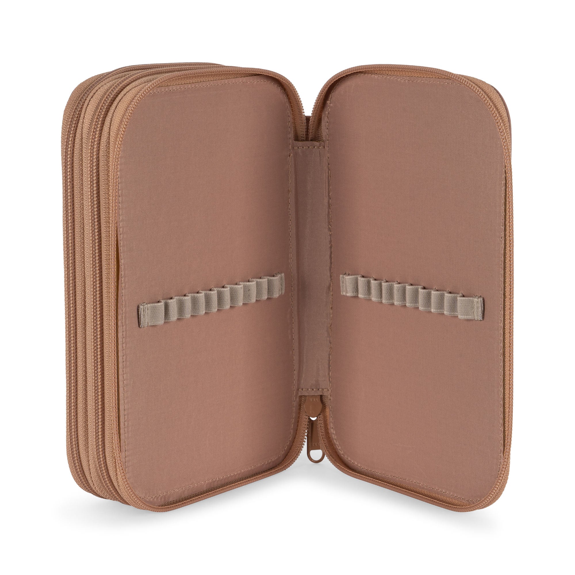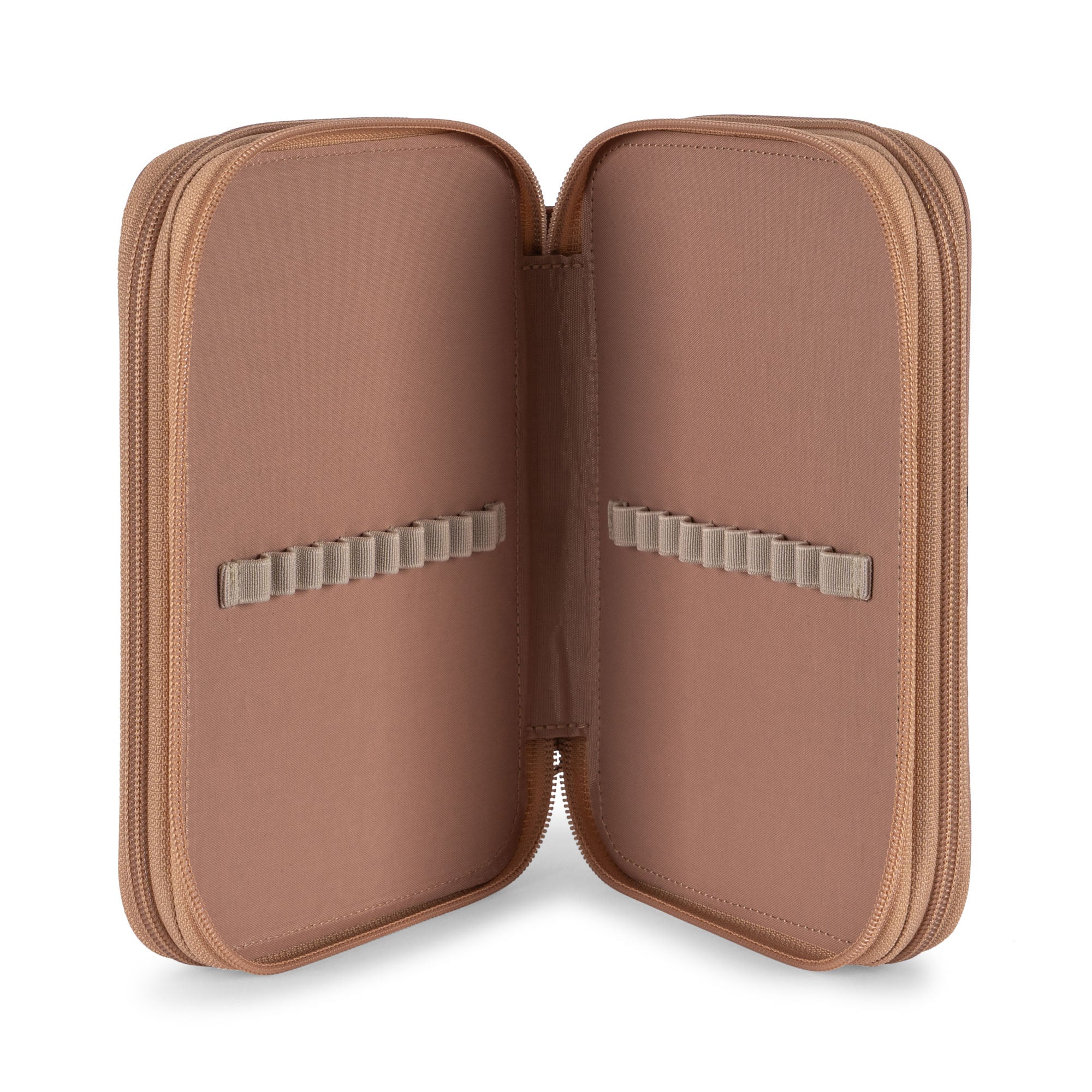 Estojo clássico com três compartimentos separados que podem acomodar tudo, desde lápis a marcadores, borrachas e réguas. Possui um bolso extra interno com zíper.