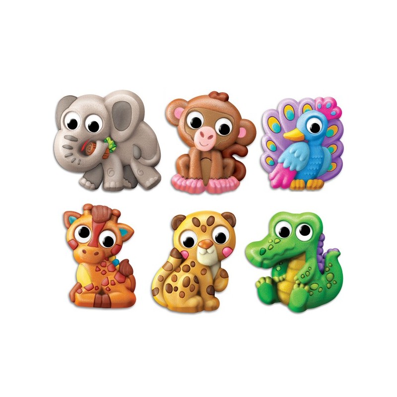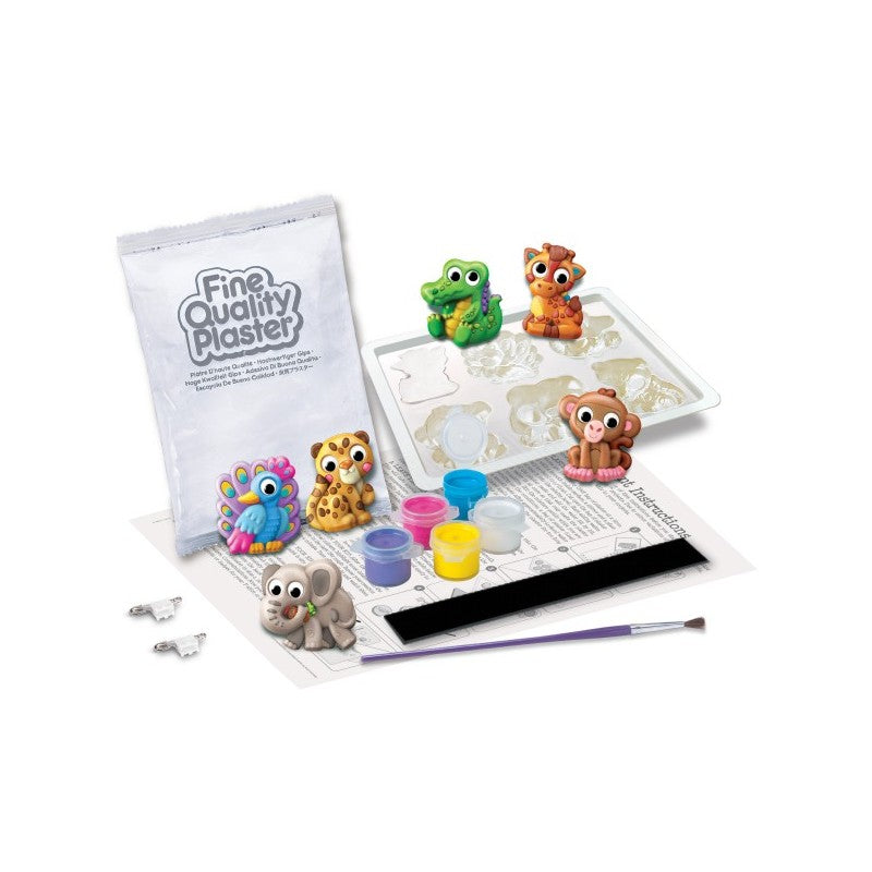Contém: 1 molde com 6 desenhos de animais, 1 saco de pó de gesso, 1 tira magnética, 2 alfinetes, 1 tira de tintas com 5 cores, 12 olhos malucos de plástico e instruções detalhadas. O conteúdo é suficiente para fazer 6 animais.