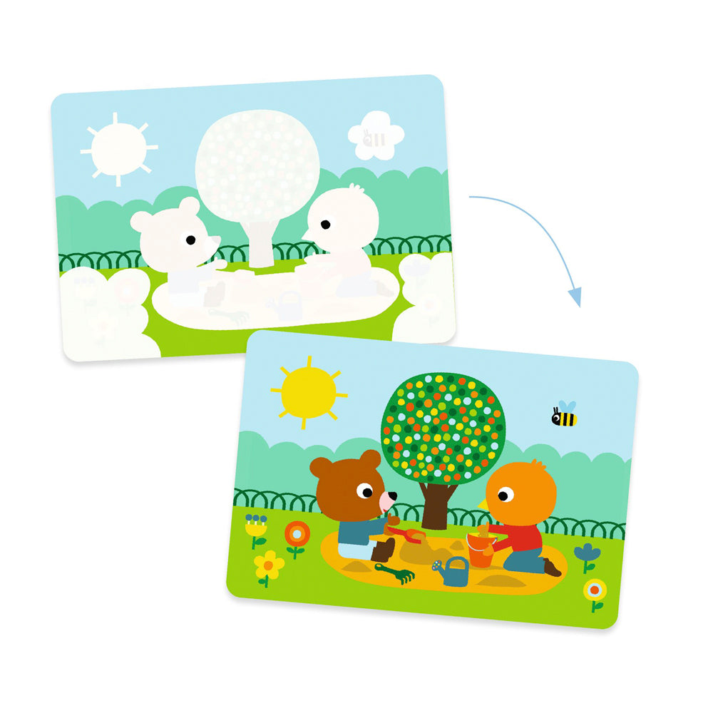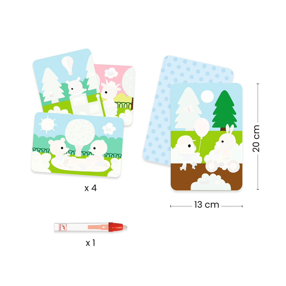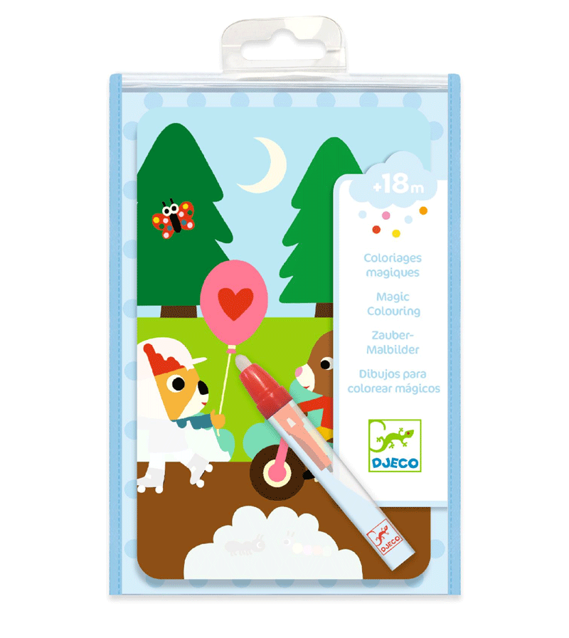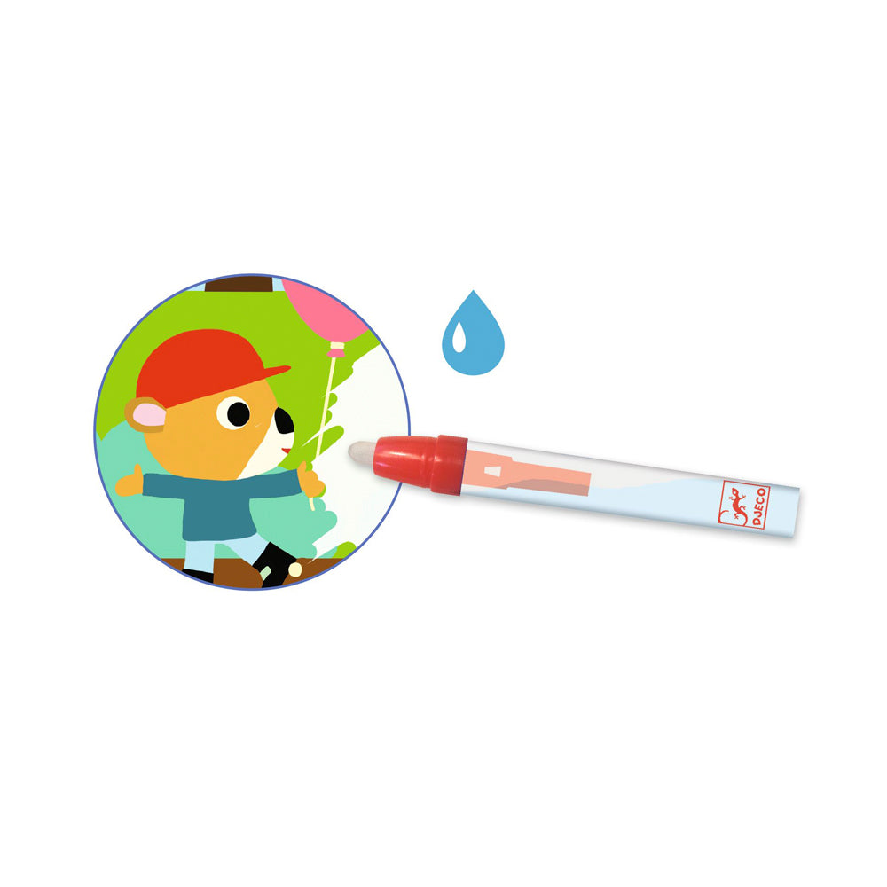Um bolso para aguarelas perfeito para crianças a partir dos 18 meses. Use o lápis cheio de água para colorir as partes brancas para revelar o que está escondido por baixo. É mágico: os padrões aparecem e mudam de cor! Quando as tábuas estiverem secas, você pode começar tudo de novo!