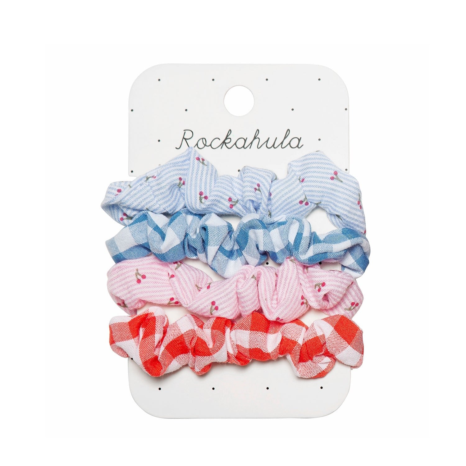 Um pacote de quatro scrunchies fofos e fáceis de usar, cada um num bonito tecido diferente. Apresentamos o nosso estampado listrado de cereja em azul e rosa e o nosso tecido guingão brilhante em azul e vermelho.