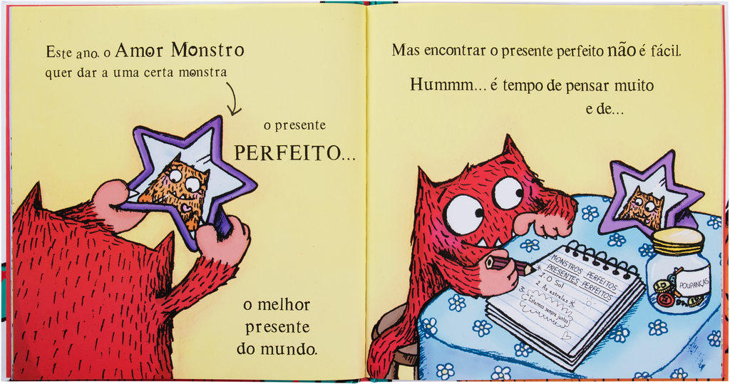 O nosso monstrinho favorito está de volta… e tem muito amor para dar.É o dia do presente em Vilamorosa e o Amor Monstro tem de encontrar o presente perfeito para a sua monstra-metade...Mas as coisas maravilhosas que vê são tão caras! Nem com todas as poupanças que tem no seu mealheiro as consegue comprar. Que pode o Amor Monstro fazer?Esta é uma história que nos lembra que, às vezes, os melhores presentes não têm de custar este mundo e o outro… Basta dar o que temos de melhor.Porque o presente perfeito vive dentro do nosso...