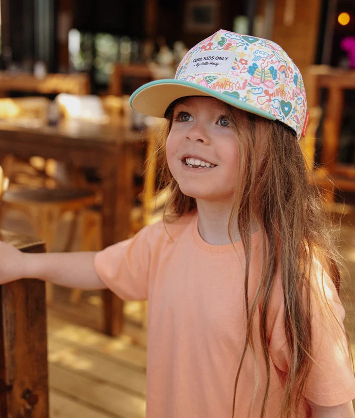 O boné Happiness para crianças e bebés apresenta um motivo floral. Boné colorido e ecológico com viseira curva.