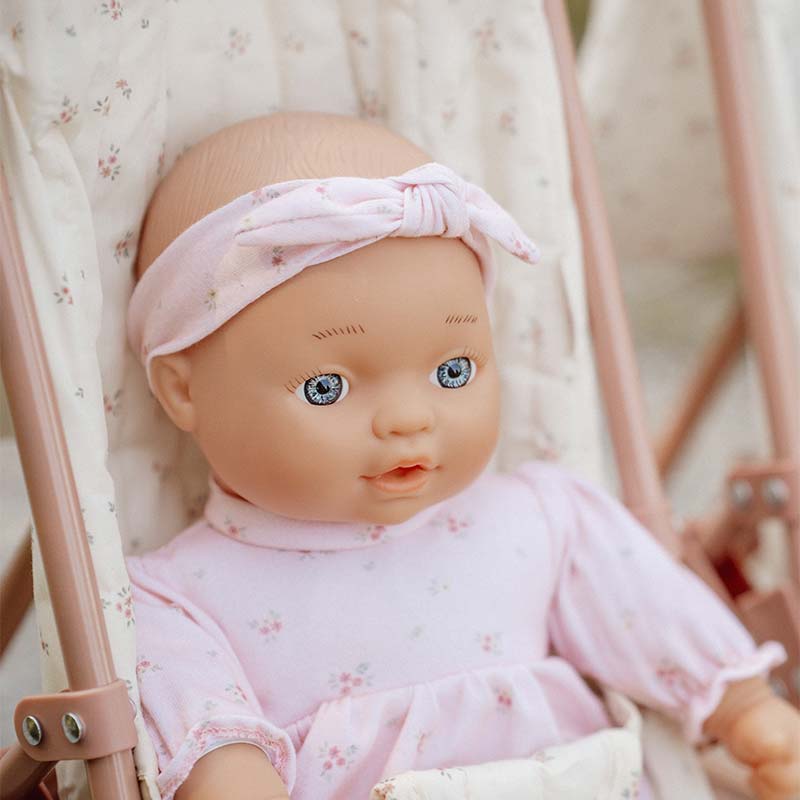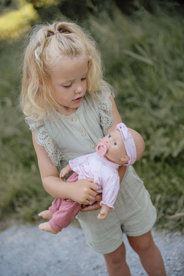 Conheça a bebé Lily. Dê-lhe um abraço e cuide dela. A Lily é uma boneca adorável e realista, com um corpo macio e fofinho, que adora ser amada. Pode trocar de roupa, ajudá-la a dormir e acalmá-la com a chupeta. Quando ela estiver com fome, ofereça-lhe o biberão. As crianças adoram imitar tudo o que os pais fazem, e esta boneca vai inspirar o seu filho a envolver-se em dramatizações de afeto e cuidado. Lily usa um vestido de mangas compridas com uma fita no cabelo ao estilo Rosy Meadows, estilizado com umas calças caneladas cor-de-rosa. Trocar de roupa promove as capacidades motoras finas, e a chupeta e o biberão acrescentam um elemento de brincadeira interativa.