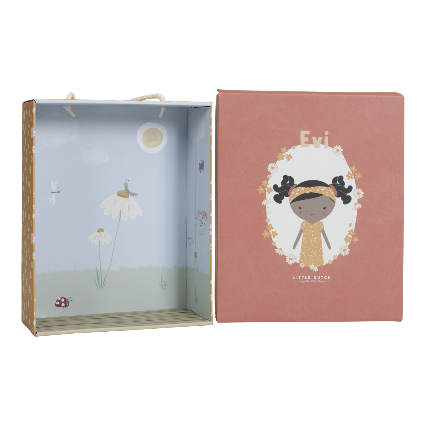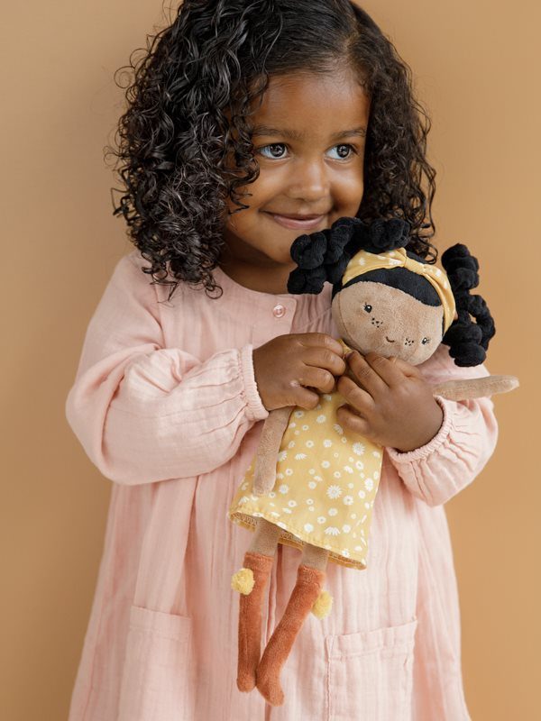 Conheça a adorável Evi. Esta boneca de pelúcia da Little Dutch com um vestido fofo quer ser abraçada. A boneca Evi tem 35 cm de altura. Evi pode sentar-se e gosta de ir contigo no carrinho de boneca de madeira Little Dutch. A boneca vem em uma linda caixa de armazenamento.