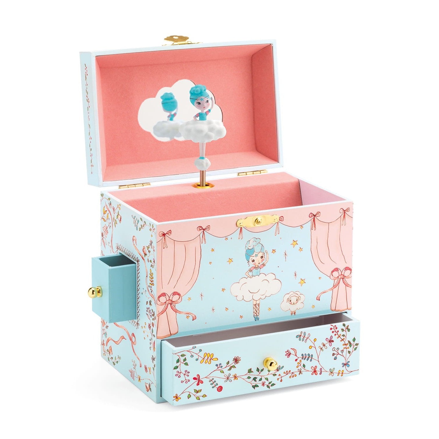Caixa de música estilo teatro da Djeco com uma bailarina; perfeita para pequenos tesouros! Uma linda caixa de música, decorada com intrincados detalhes de flores e projetada para parecer um palco, é o lugar perfeito para as meninas guardarem jóias e lembranças especiais. Dê corda, abra a caixa e observe a bailarina girando ao som da música Romance. Possui 3 gavetas e o interior da caixa é forrado com um feltro macio pastel para proteger as jóias. Um presente perfeito para um batizado, Natal ou aniversário.
