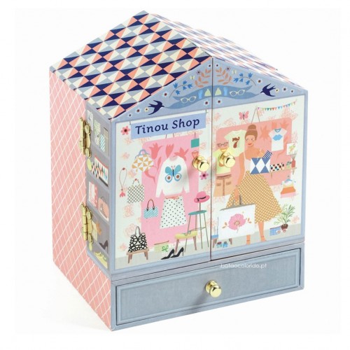 Tinou Shop é uma caixinha de música lindamente ilustrada com três gavetas para guardar suas joias e segredos. Vire a manivela, abra as portas desta linda loja e surpreenda-se! Uma garota finamente esculpida se vira e projeta seu reflexo em um espelho moldado ao som da música “A Flauta Mágica” de Wolfgang Amadeus Mozart.