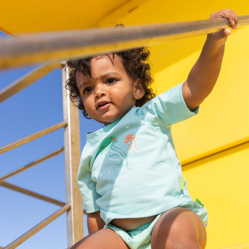 Esta t-shirt com proteção solar UV FPS 50+ irá proteger o seu filho durante os dias de sol na praia e na piscina. O seu tecido é muito macio e flexível, super respeitador da pele sensível do seu bebé. Tem também um alto nível de resistência ao cloro, perfeito para usar na piscina!