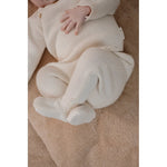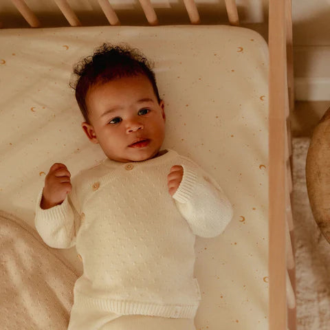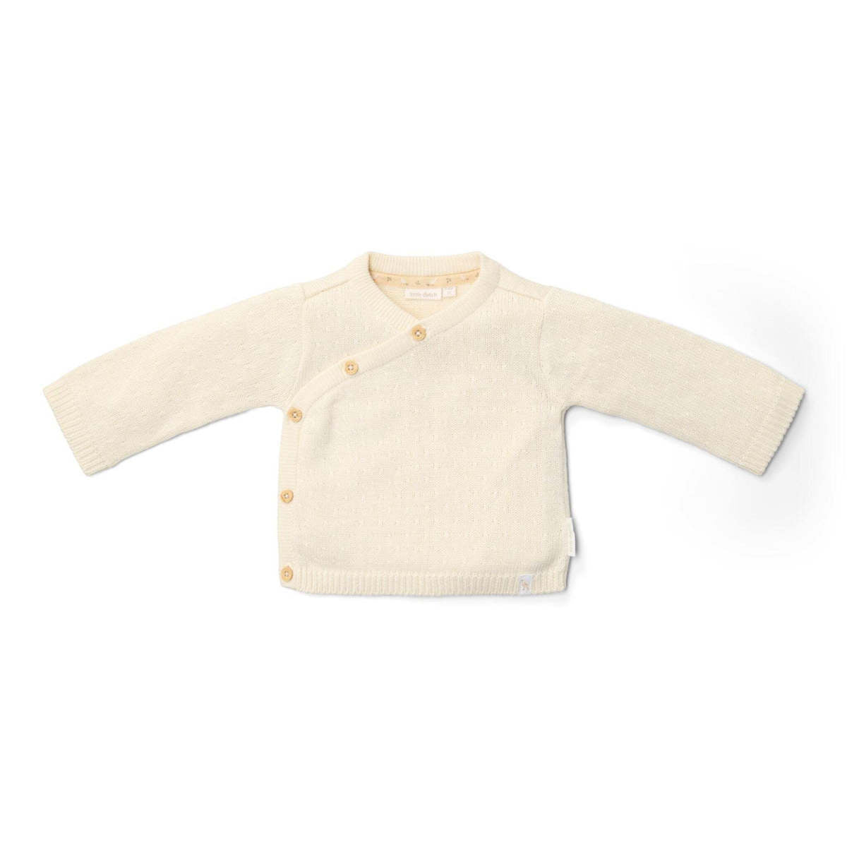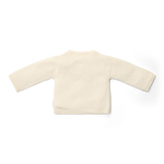 Um lindo casaquinho para os dias frios! Este casaquinho de malha trespassado na cor Off White com um subtil efeito de bolinhas não é apenas macio, mas também elegante e quente. Os charmosos botões com aspeto de madeira e o design trespassado facilitam na hora de vestir e despir. Feito de algodão orgânico e com certificação Oeko-Tex, pode ter a certeza de que o casaquinho é suave para a pele do seu pequenote. Combine-o com as calças e os acessórios a condizer para um look completo e confortável.