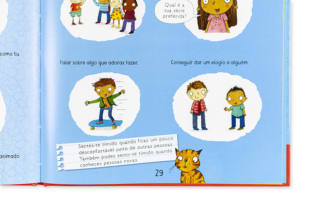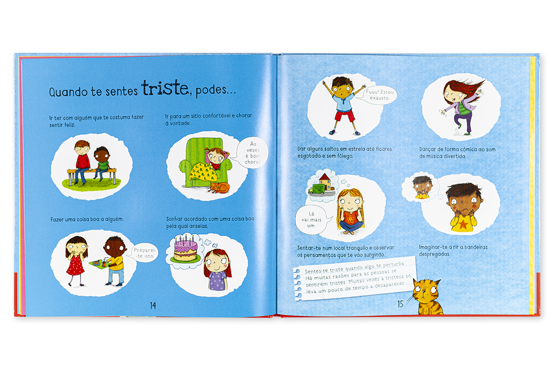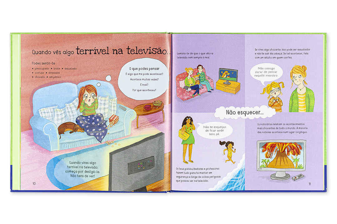 - A destacar: Capa dura; exemplos práticos de situações com as respetivas sensações, pensamentos e possíveis soluções; glossário; guia para pais, para ajudar a criança a manifestar as suas preocupações.