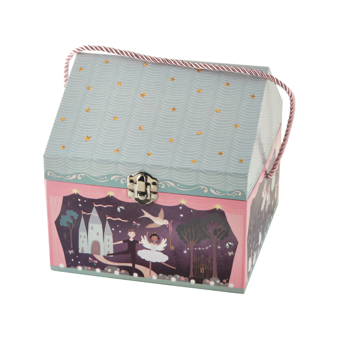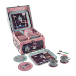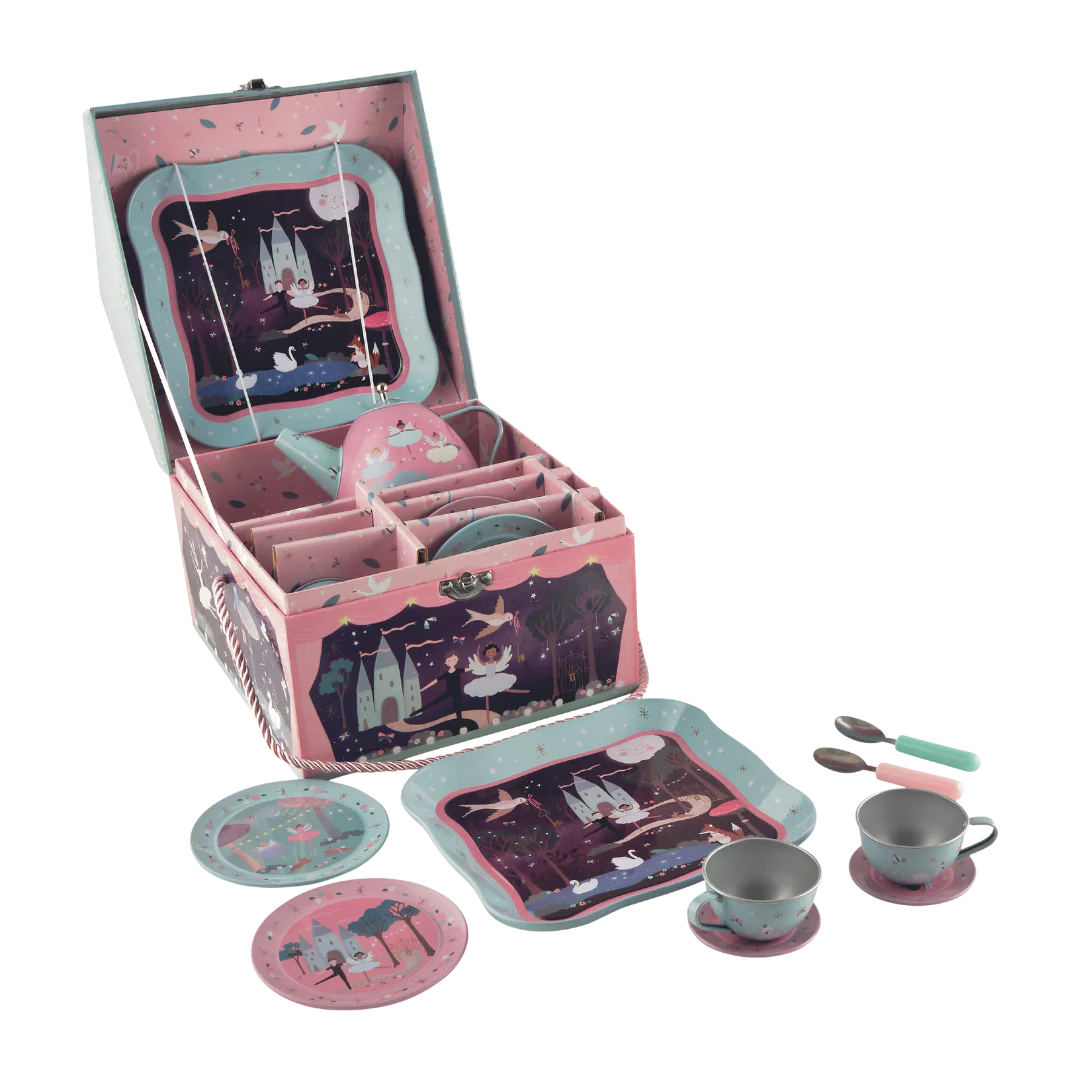 Um fabuloso serviço de chá musical em lata. Abra a bonita caixa ilustrada em formato de teatro para encontrar um conjunto de chá completo, incluindo 1 bule musical, 1 bandeja, 2 colheres, 2 chávenas, 2 pires e 2 pratos. Usa a corda por baixo do bule para tocar a música "O Lago dos Cisnes" enquanto serves o chá. O design apresenta bailarinas, castelos, florestas encantadas, pássaros, cisnes e lagos. Um presente maravilhoso para que os seus pequenos se divirtam com brincadeiras imaginativas ou com os amigos. Possui uma pega rosa entrançada para facilitar o transporte.