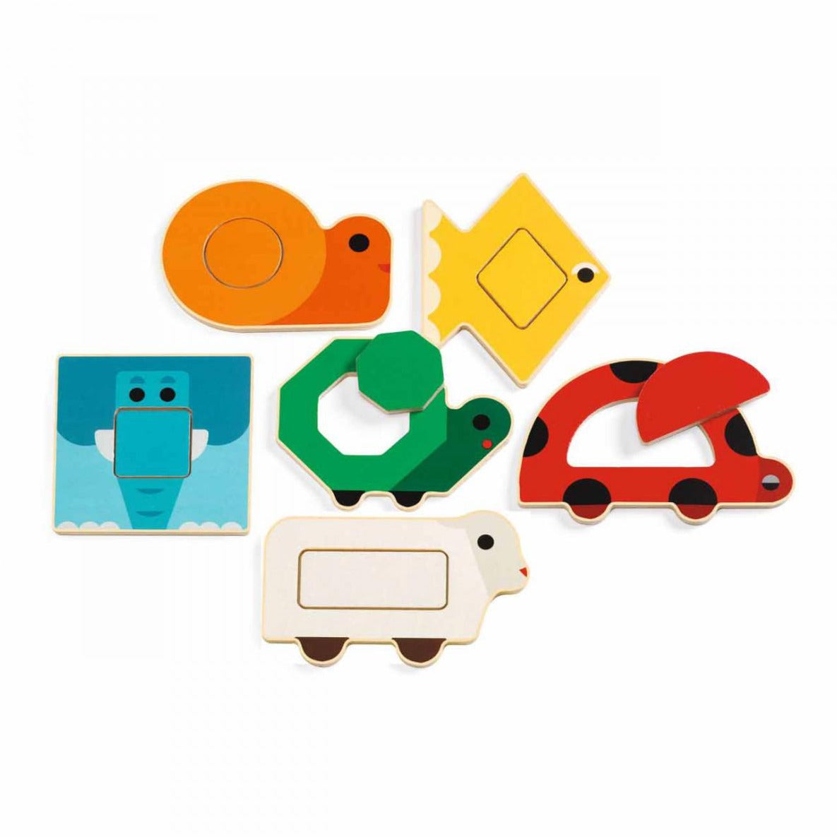 - Cada um desses quebra-cabeças tem 2 partes, sendo a peça interna uma forma. Há um caracol laranja com um interior redondo, uma tartaruga verde com um interior hexagonal, um peixe amarelo com um interior em forma de diamante, uma joaninha vermelha com um interior em forma de semicírculo, um elefante azul com um interior quadrado e uma ovelha branca com um retângulo interno.