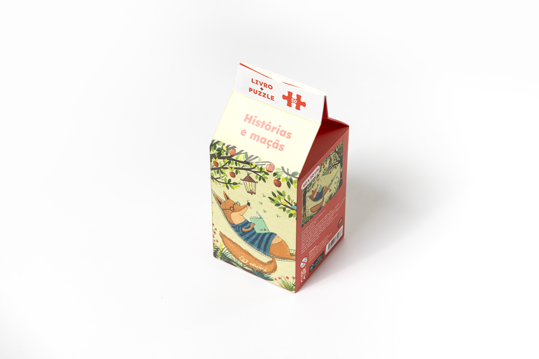 - Na mesma caixa, um puzzle de 40 x 30 cm, com 50 peças em cartão, e um livro cartonado ilustrado, de pequeno formato, com uma fábula de linguagem simples e acessível, ideal para os primeiros exercícios de escuta e/ou leitura;