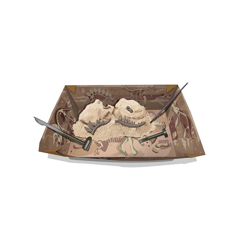 - Contém: 1 bloco de gesso com um esqueleto de dinossauro embutido, 1 bandeja de escavação em papel, 1 aba autocolante para posicionamento das juntas, 1 martelo, 1 cinzel, 1 pincel e instruções detalhadas.