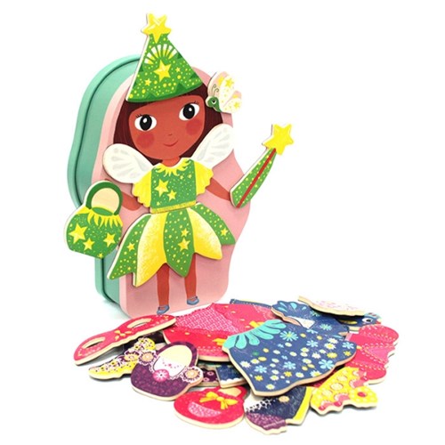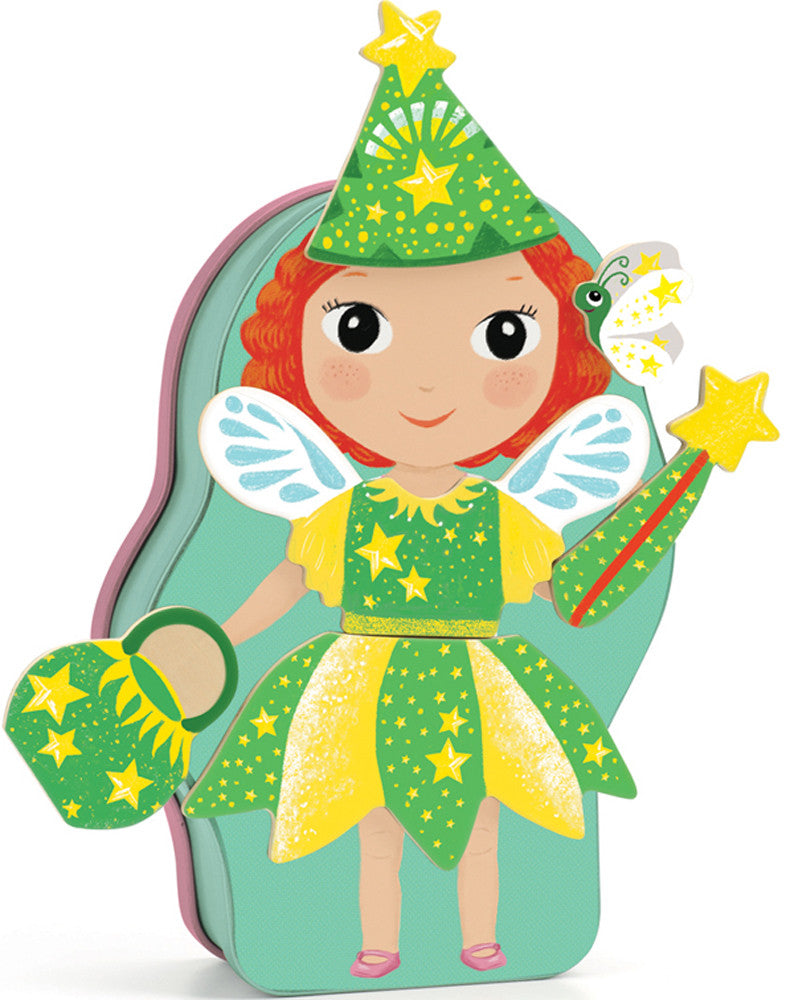 Toque e faça diferentes cenas de Princesas e Fadas usando as 27 peças magnéticas de madeira e cole-as na lata magnética. A lata magnética tem a forma de um corpo com um rosto impresso em ambos os lados, com um lado rosa e um verde pálido. Coloque os diferentes ímãs em forma na lata e jogue por horas – depois que a diversão acabar, guarde-os na lata.