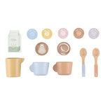 Hora de uma boa chávena de café ou chá! Com esta máquina de café de madeira, os pequenos baristas podem moer os grãos, colocar as cápsulas de café e mexer a bebida com uma colher. O conjunto inclui duas chávenas, duas colheres, um jarro de leite, pacotes de leite e até formas de cappuccino para uma verdadeira experiência de café. Há ilustrações alegres na parte de trás da máquina. Perfeita para combinar com o cantinho do café de brincar para ainda mais diversão. O que será hoje: café ou chá?